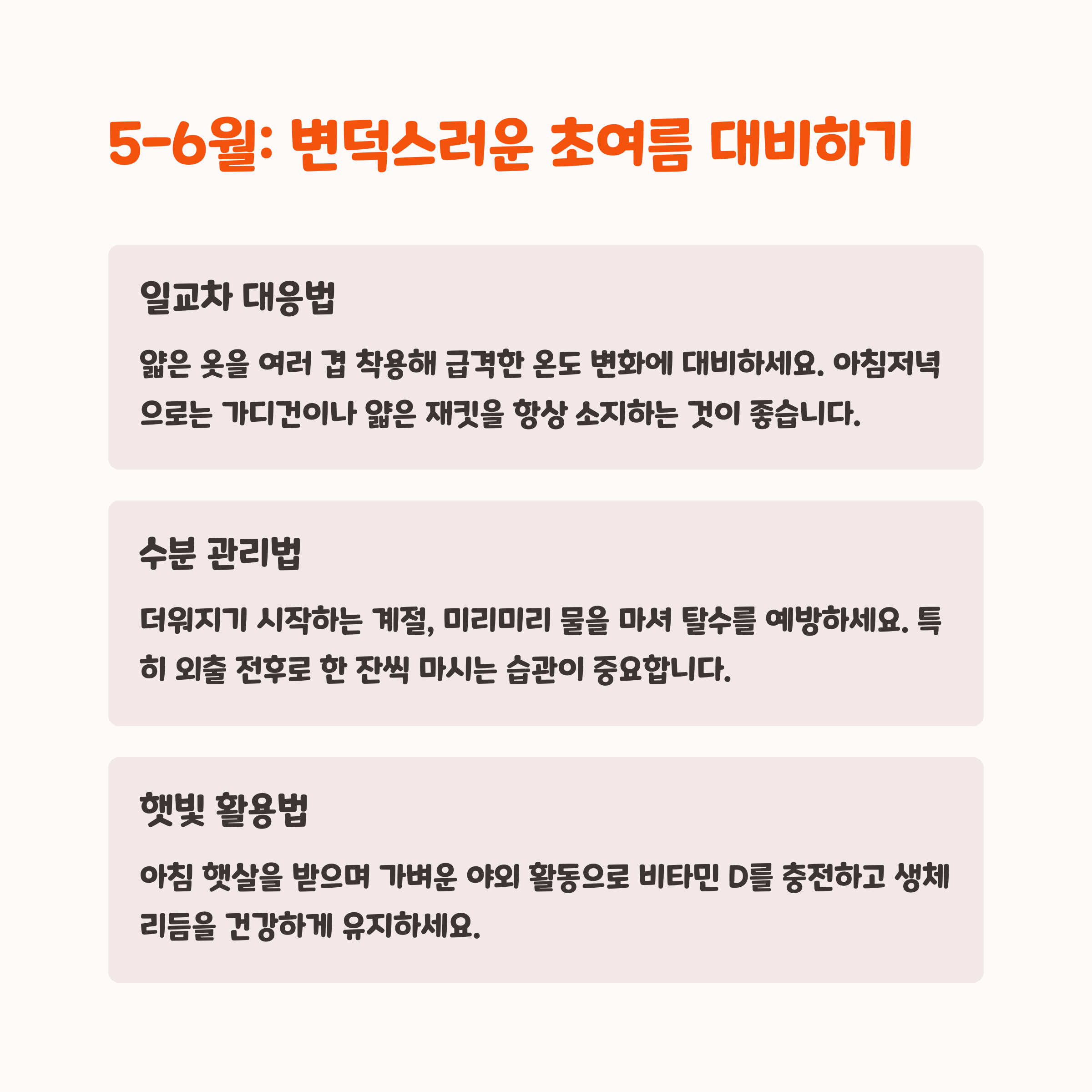 | 면역력 강화, 실내 환경 관리 | 수분 보충, 자외선 차단 | 감기 예방, 비타민 섭취 |