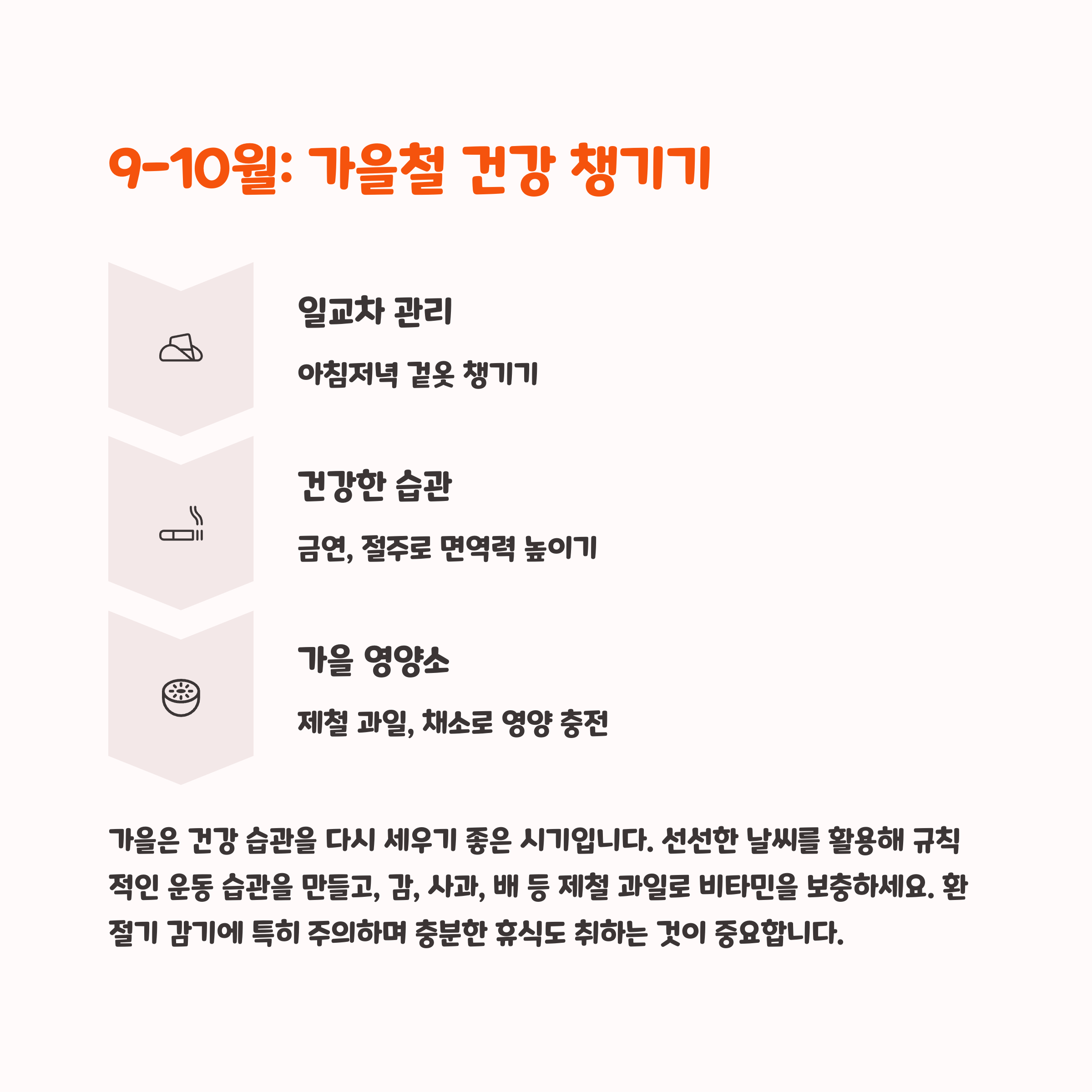 가을은 면역력 저하가 흔한 시기입니다. 일교차가 심해지면서 감기와 호흡기 질환이 증가할 수 있어 비타민 C 섭취가 중요합니다. 규칙적인 운동과 균형 잡힌 식습관을 유지하는 것이 건강한 겨울을 준비하는 핵심입니다.