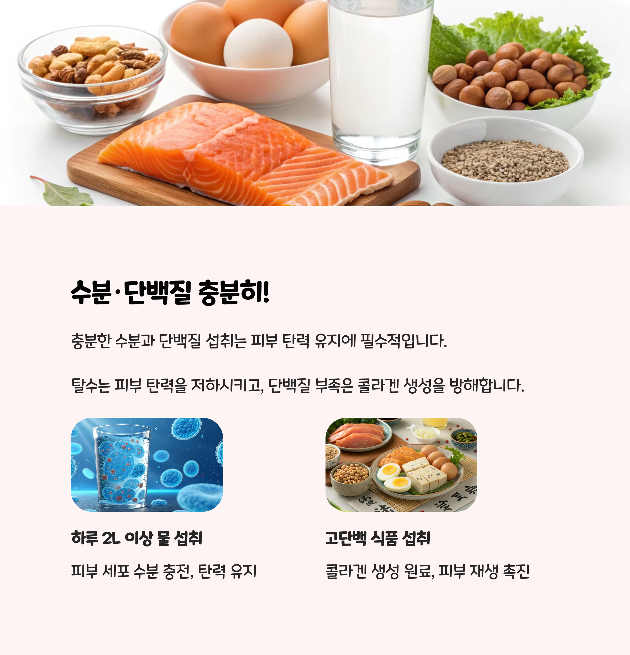 수분 섭취: 하루 1.5~2리터의 물을 마시면 피부 보습과 탄력 유지에 도움이 됩니다.단백질 섭취: 콜라겐 생성을 돕는 단백질을 충분히 섭취하세요.충분한 수면과 피부 보습: 피부 재생을 위해 매일 7시간 이상 숙면하고, 보습제를 꼼꼼히 바르세요.
