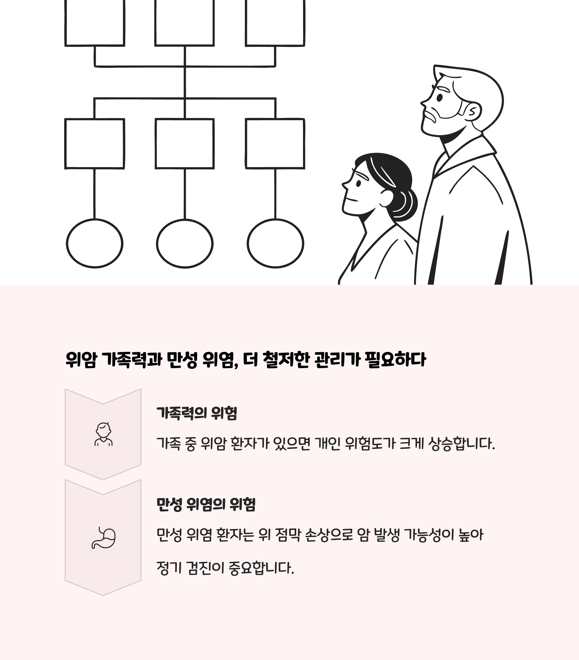 헬리코박터 감염, 고염식, 흡연, 음주, 위축성 위염, 유전적 요인 등이 위암 위험요인입니다. 위험요인이 있으면 정기검진과 생활습관 개선이 필수입니다.