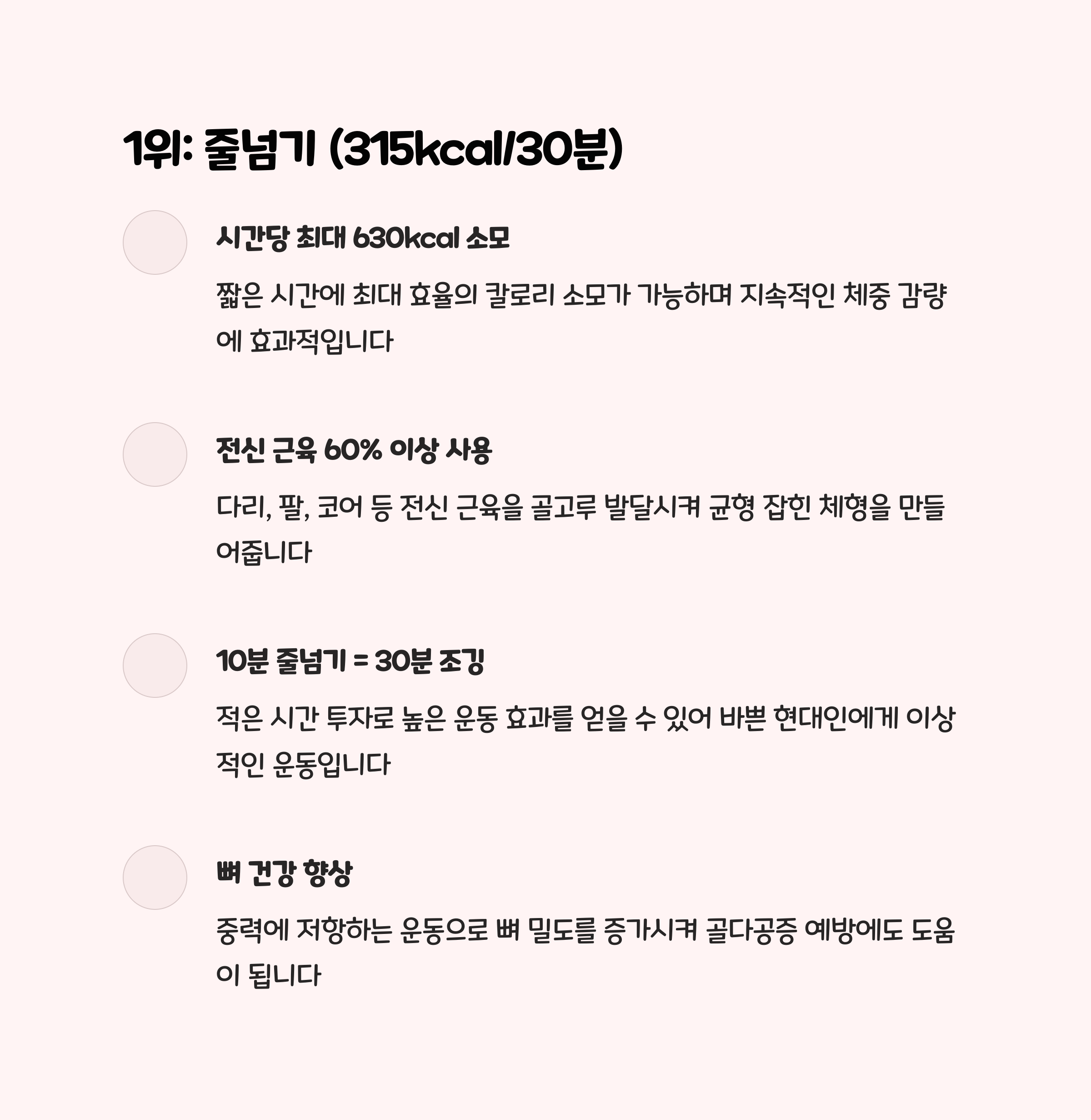 | 줄넘기 | 315kcal | 전신/민첩성/균형 |