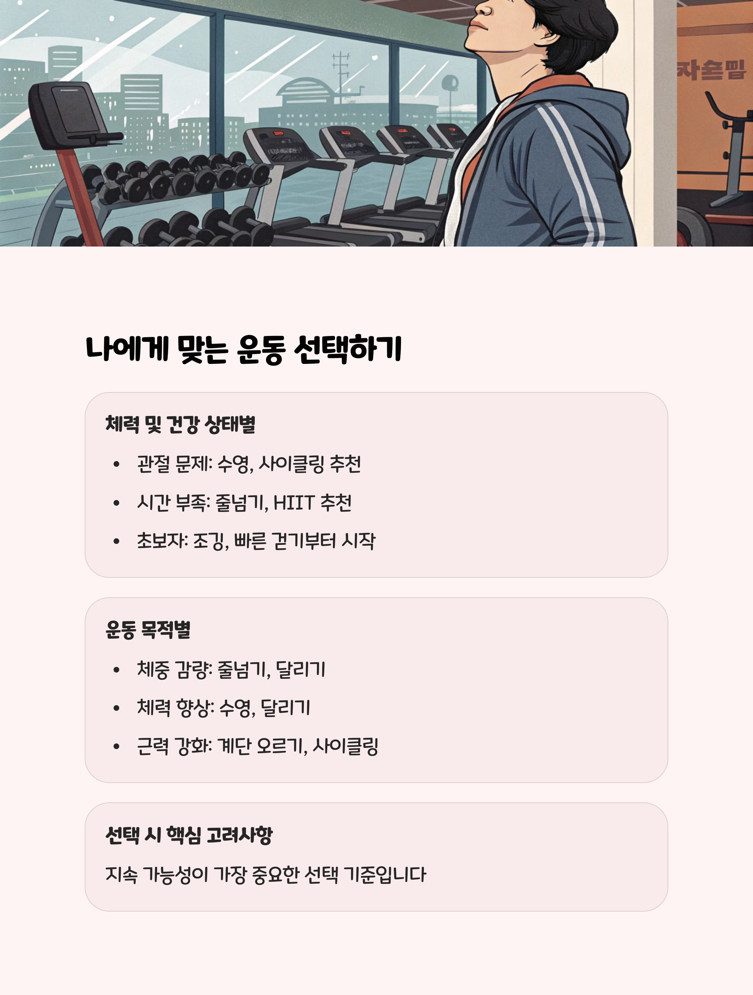 - 장점 : 관절 부담이 적고, 실내외에서 모두 즐길 수 있습니다.