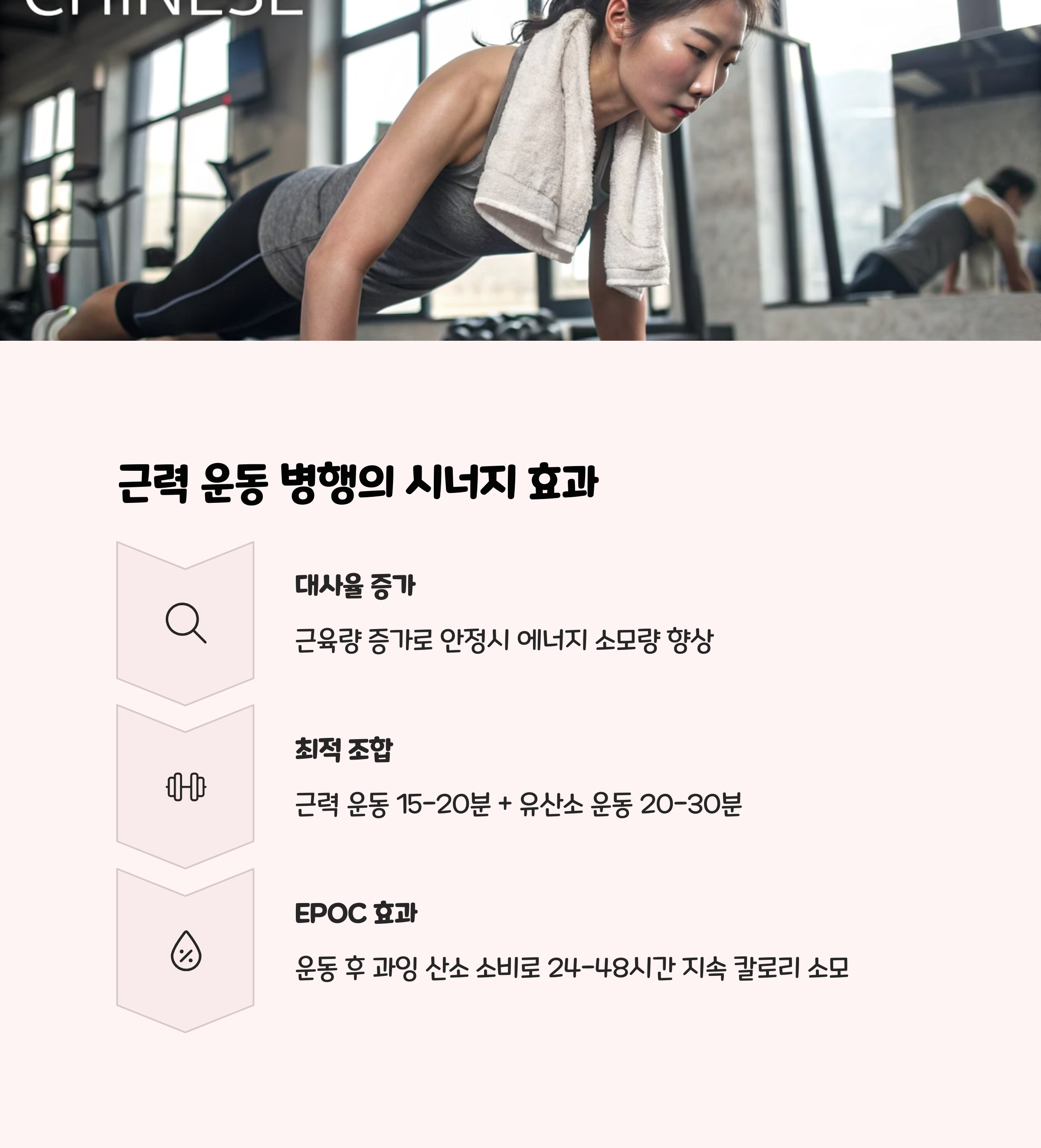 2. 유산소·근력운동 결합 : EPOC 효과로 운동 후 14시간 동안 추가 7~15% 칼로리 소모