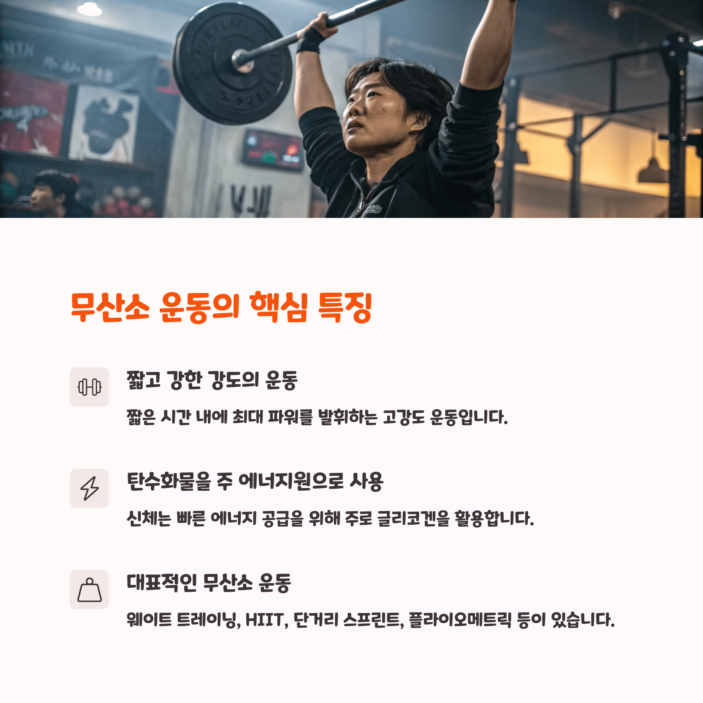 | 유산소 운동 | 장시간 지속 가능한 강도로 운동하며 체지방 연소에 효과적입니다. |