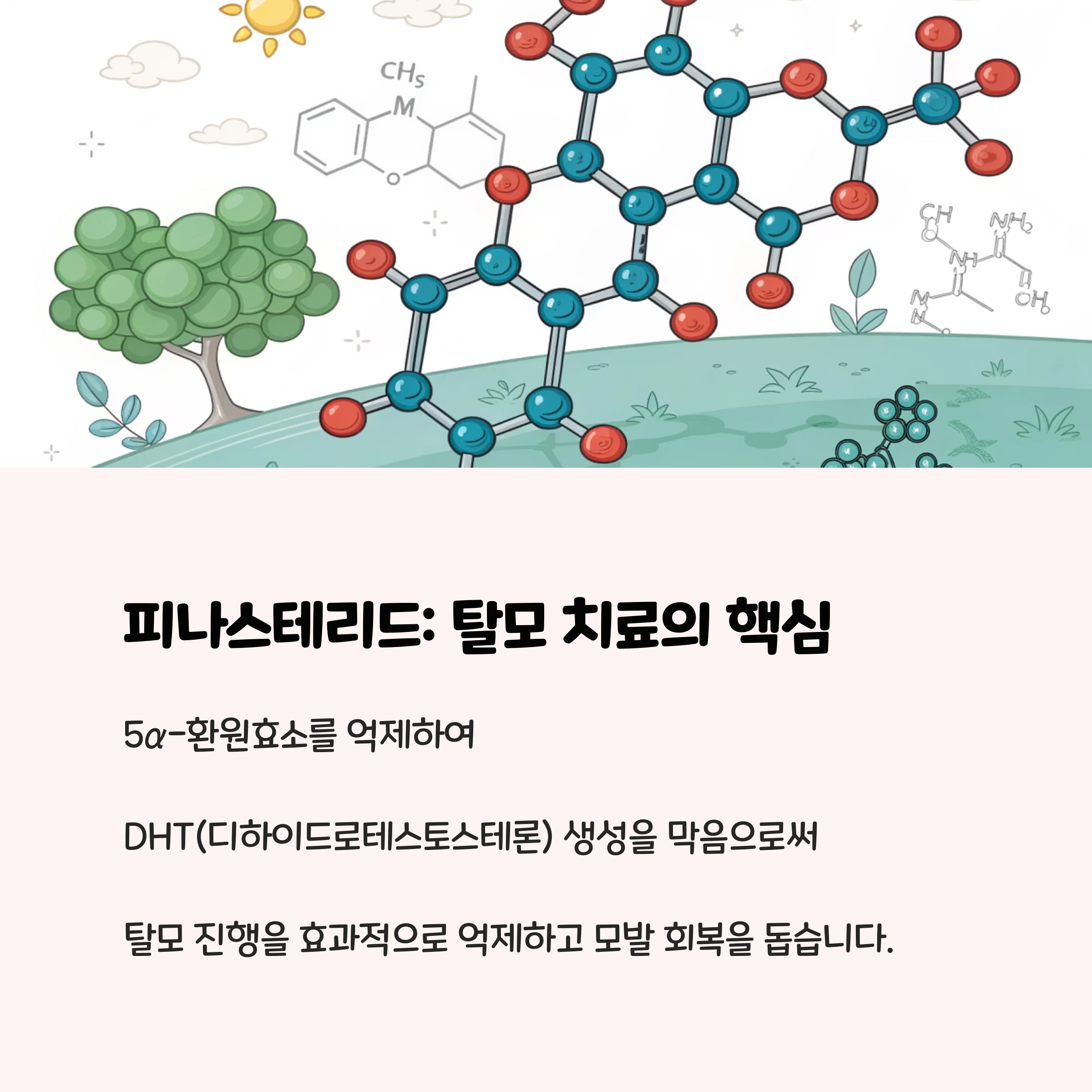 주요 원인은 DHT(디하이드로테스토스테론)라는 남성호르몬의 영향입니다. 이 호르몬에 민감한 유전자를 가진 경우 모낭이 점차 위축되어 모발이 가늘어지고, 성장이 멈추면서 탈모가 진행됩니다. 스트레스 등 환경적 요인도 영향을 줄 수 있습니다.