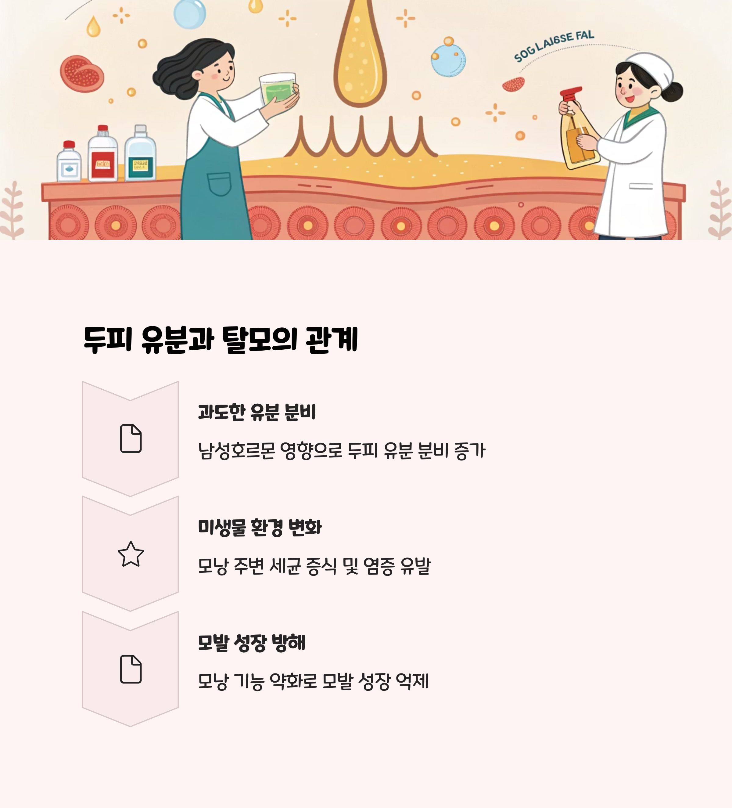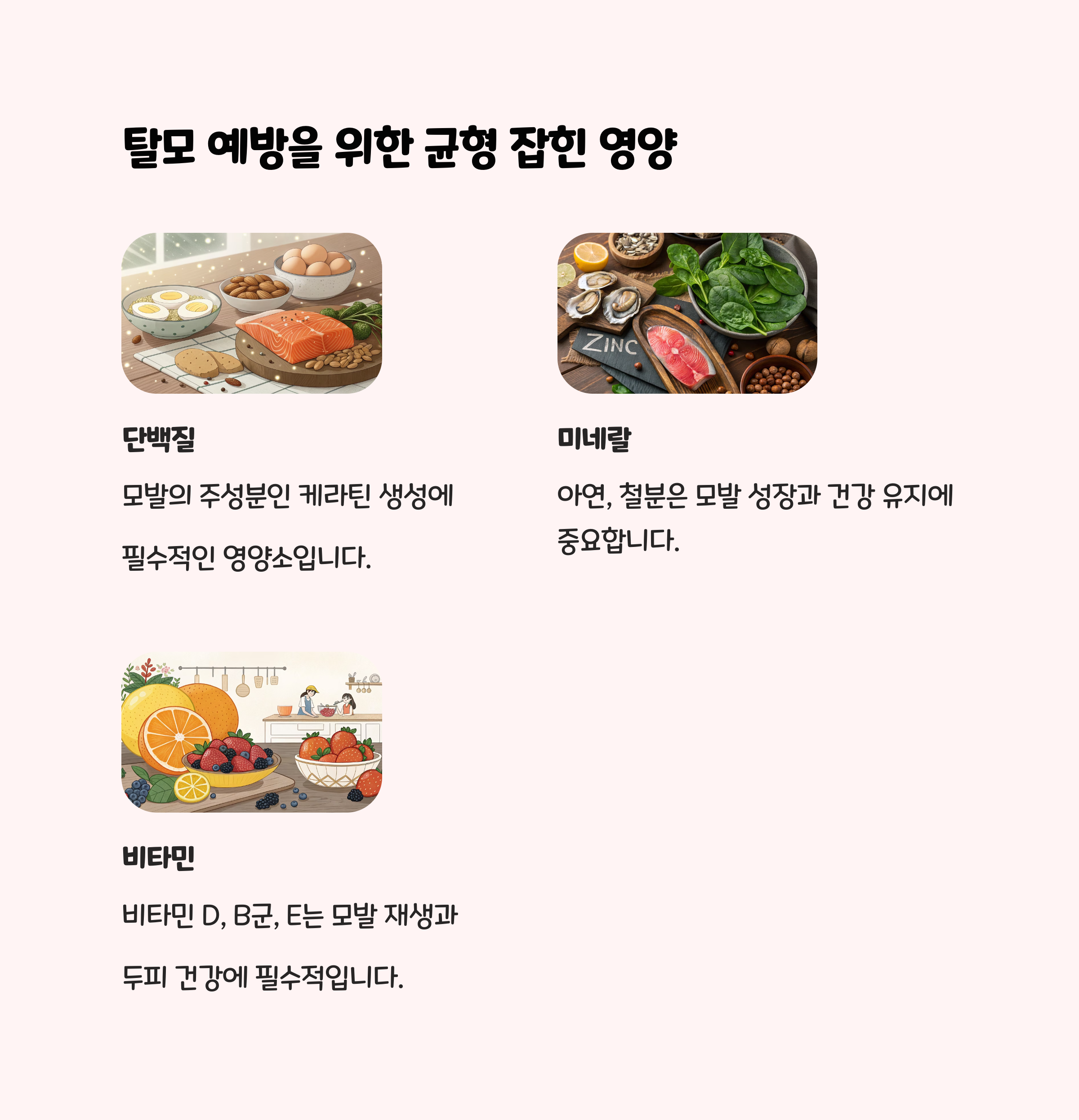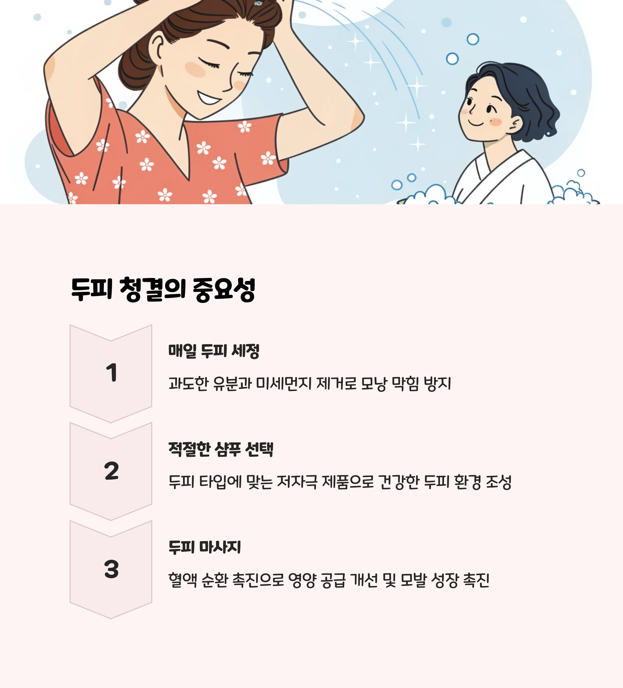 균형 잡힌 식사: 비오틴, 아연, 철분 등 모발 건강에 필수적인 영양소를 꾸준히 섭취하세요.스트레스 관리: 운동, 명상, 충분한 수면 등으로 스트레스를 줄이면 호르몬 균형이 유지되어 탈모 악화를 막을 수 있습니다.두피 청결: 하루 한 번 부드럽게 머리를 감아 두피의 노폐물과 피지를 제거하고, 자극이 적은 샴푸를 사용하세요.전문가 상담: 탈모가 의심된다면 조기에 피부과 전문의의 진단을 받아 내게 맞는 치료를 시작하는 것이 중요합니다.
