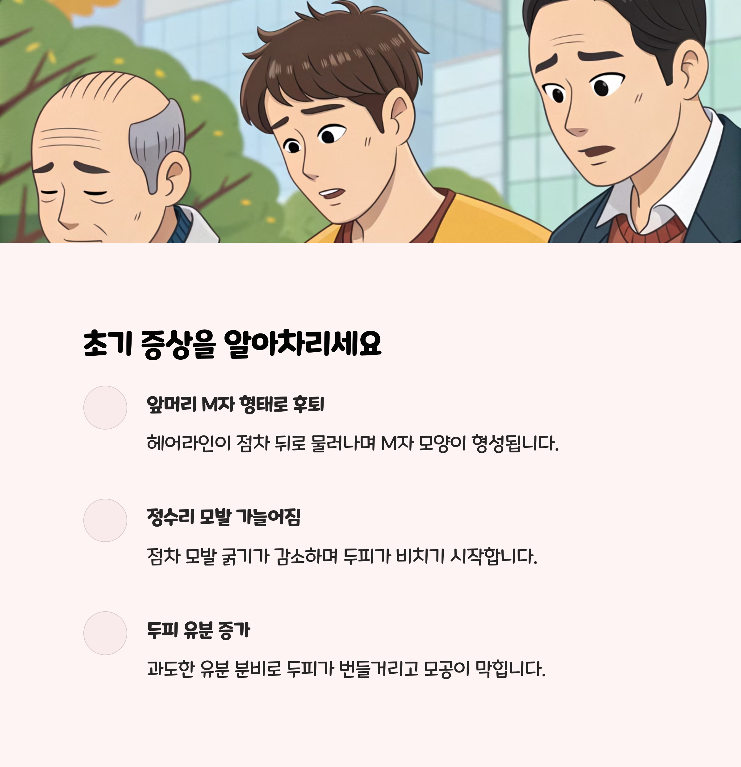 유전성 탈모는 대부분 앞머리 양쪽 끝 헤어라인이 점차 뒤로 밀리거나, 정수리 부위의 모발이 가늘어지는 것에서 시작됩니다. 남성은 M자 형태로 이마가 넓어지거나 정수리의 모발이 점차 약해지고, 여성은 주로 가르마선이 넓어지거나 정수리 부위의 숱이 줄어드는 양상이 흔합니다.
