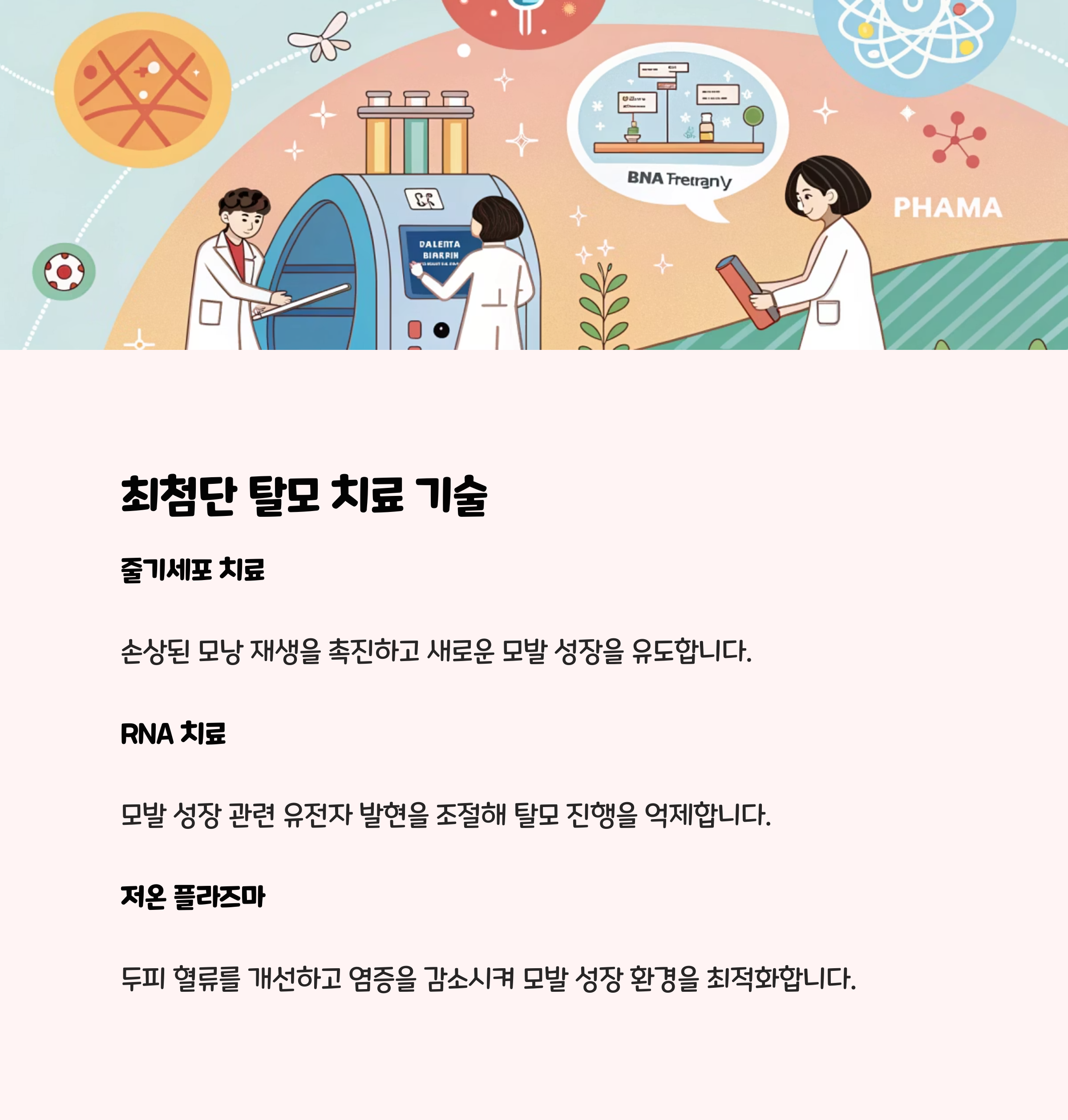 경구용 약물(피나스테리드, 두타스테리드): 남성호르몬(DHT) 생성을 억제해 탈모 진행을 늦춥니다. 3~4개월 이상 복용해야 효과를 느낄 수 있으며, 1년 이상 꾸준히 복용하면 모발 상태가 안정됩니다.국소 도포제(미녹시딜): 남녀 모두 사용 가능하며, 모발 성장 촉진 효과가 있습니다. 사용 후 일시적으로 머리카락이 더 빠지는 ‘쉐딩’ 현상이 나타날 수 있으나, 이는 새로운 모발 성장의 신호입니다.줄기세포·RNA 치료 및 저온 플라즈마 등 최신 시술: 2025년 기준, 줄기세포를 이용한 모낭 재생, RNA 간섭기술, 저온 플라즈마 치료 등 첨단 치료법이 도입되고 있습니다. 이들 치료는 유전자 맞춤형 접근이 가능해 앞으로 실용화가 기대됩니다.