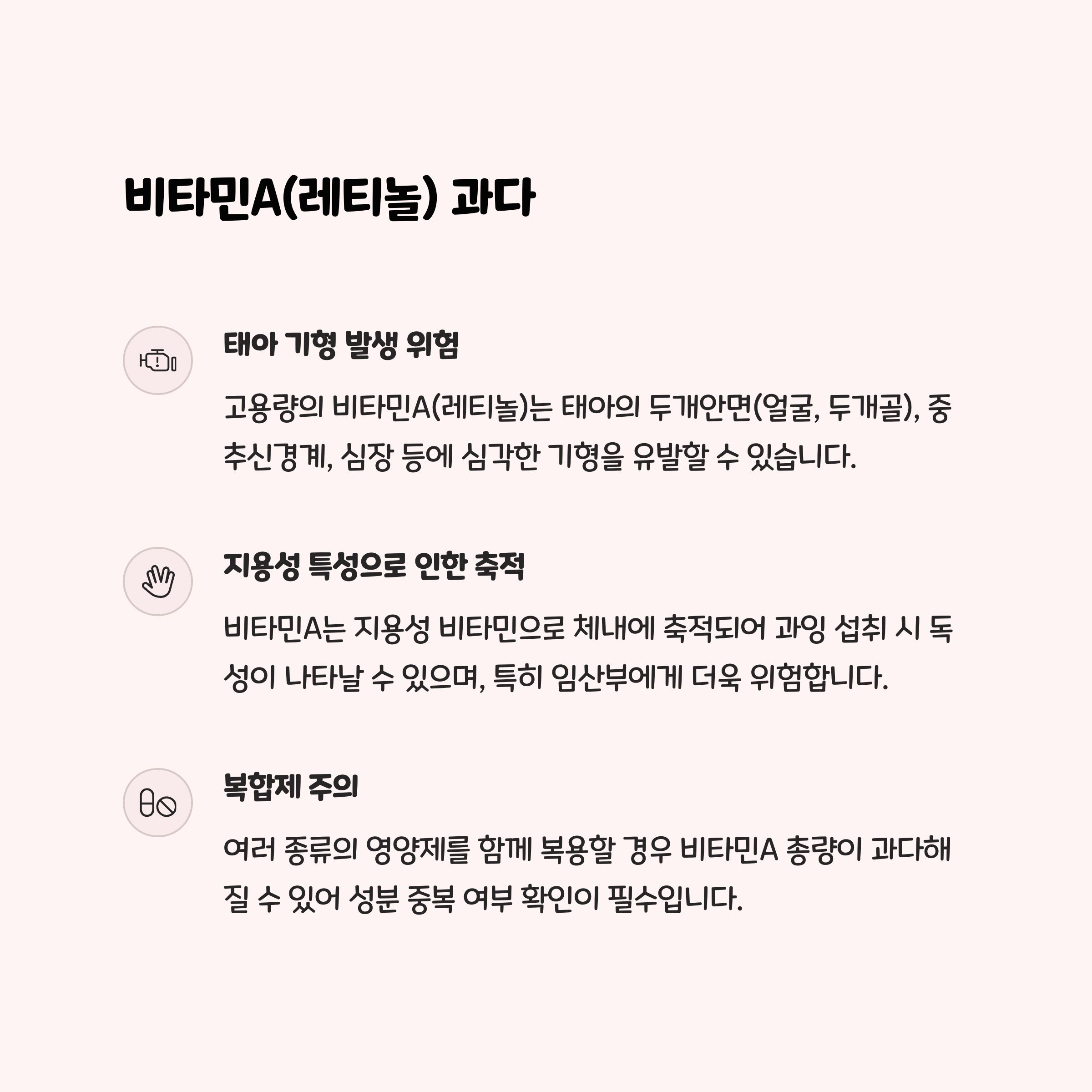 비타민A(레티놀), 요오드, 허브 추출물 등 위험 성분의 함량과 종류를 반드시 확인하세요.