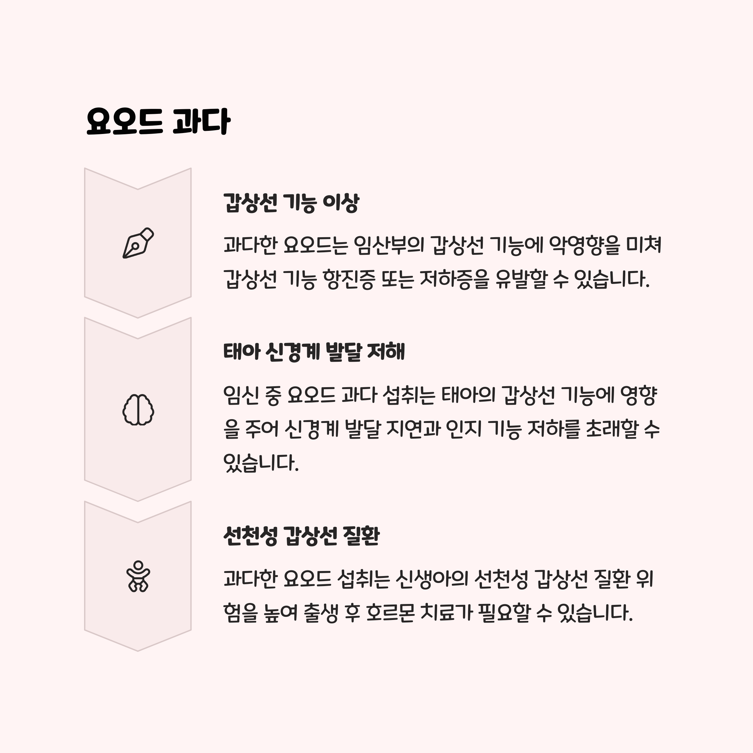 요오드는 갑상선 호르몬의 주요 성분으로, 태아의 뇌와 신경 발달에 필수적입니다. 하지만 임신 중 요오드를 과다 복용하면 태아와 신생아의 갑상선 기능 이상, 갑상선종, 성장 장애 등을 유발할 수 있습니다. 한국인의 식습관(미역, 김, 멸치 등 해조류 섭취가 많음)을 고려하면, 별도의 요오드 영양제 복용은 오히려 과잉 위험이 큽니다. 임산부의 1일 요오드 권장량은 240μg, 상한선은 1,100μg입니다. 라벨에 ‘요오드’ 또는 ‘아이오딘’이 포함되어 있다면, 식단과 중복되지 않도록 주의하세요.