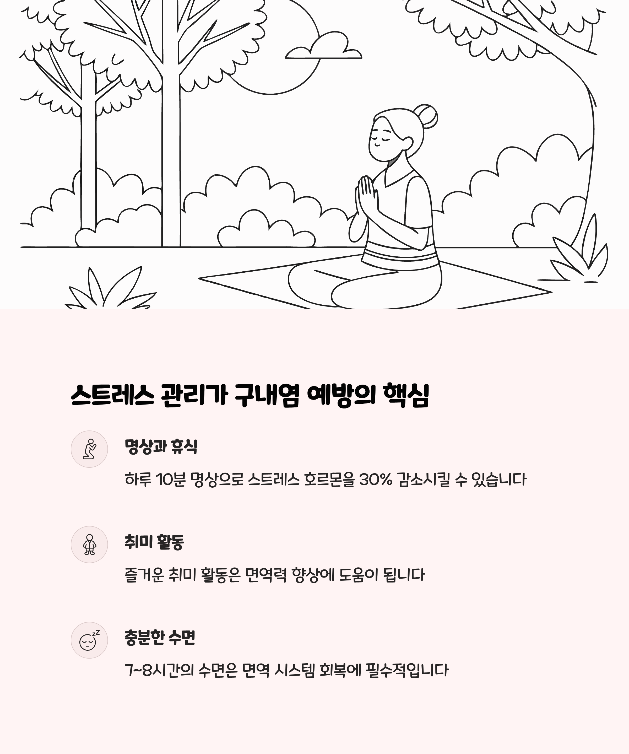 | 충분한 휴식과 스트레스 조절 | 규칙적인 운동, 충분한 수면, 명상 등으로 면역력 강화 |