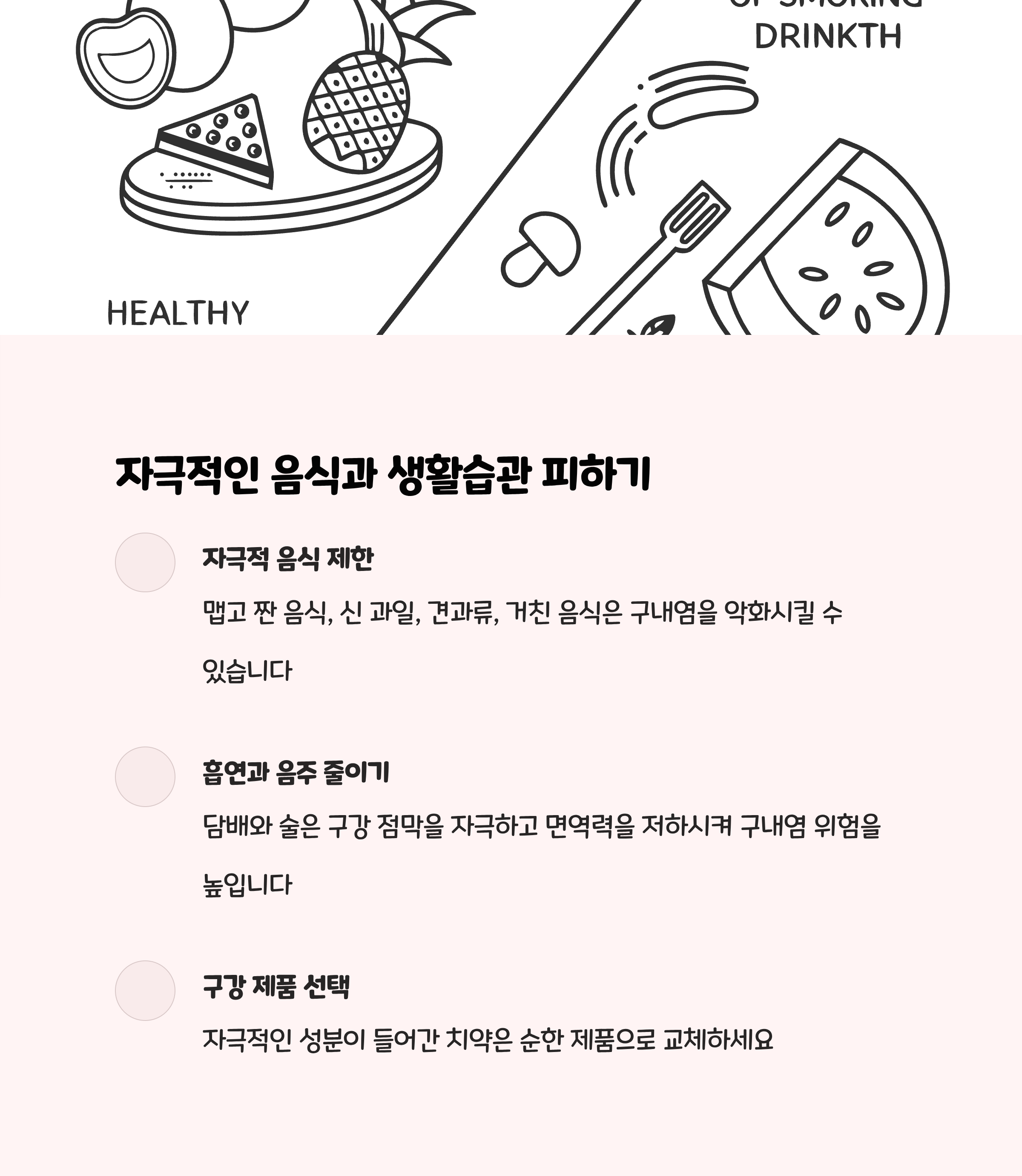 | 흡연 및 음주 제한 | 담배와 과음은 구강 점막 자극으로 구내염 악화 방지 |
