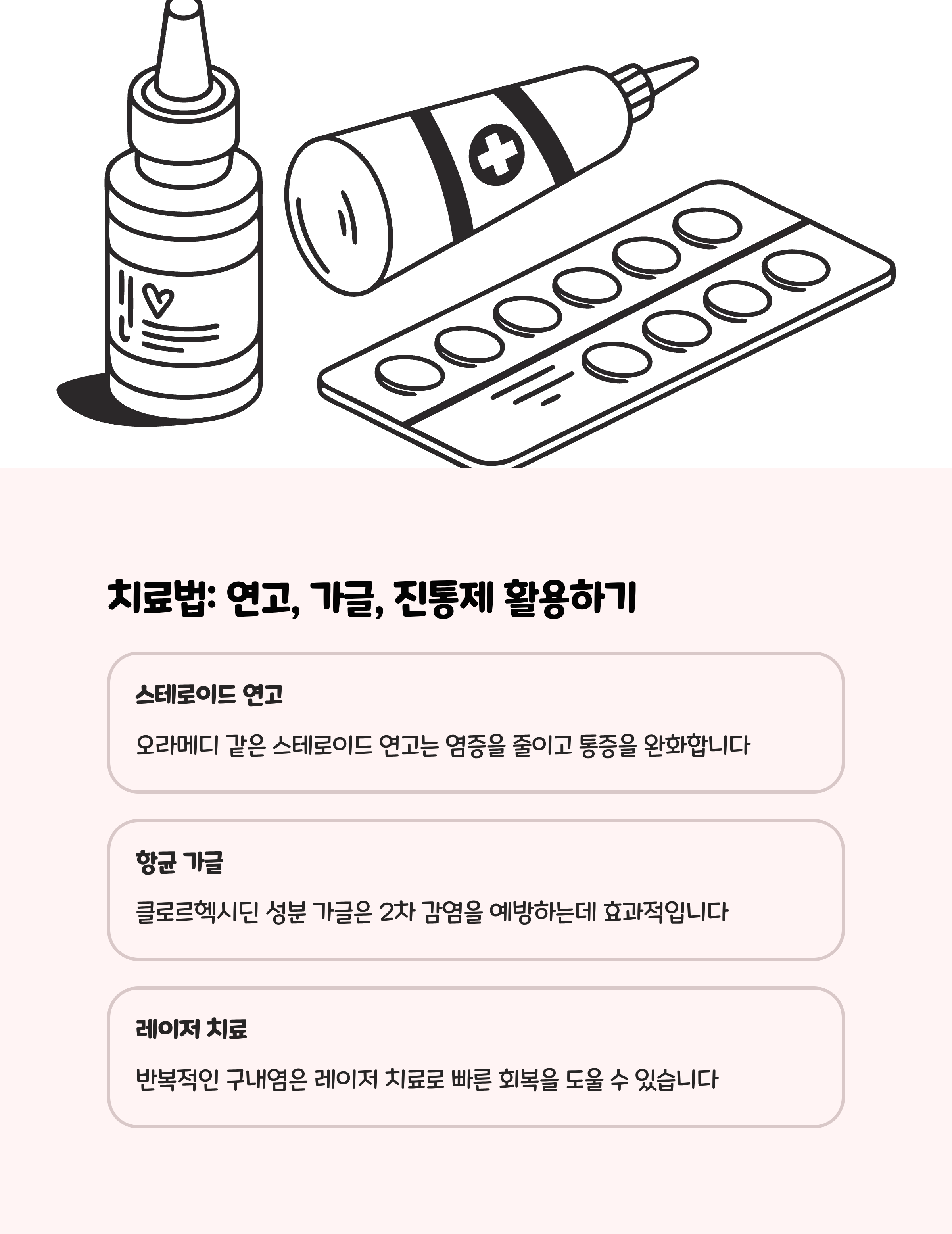 국소 스테로이드 연고, 항염 가글약은 통증 완화와 회복 기간 단축에 도움 됩니다. 단, 장기 사용은 부작용 우려가 있으므로 전문의 처방에 따라 사용하는 것이 안전합니다.