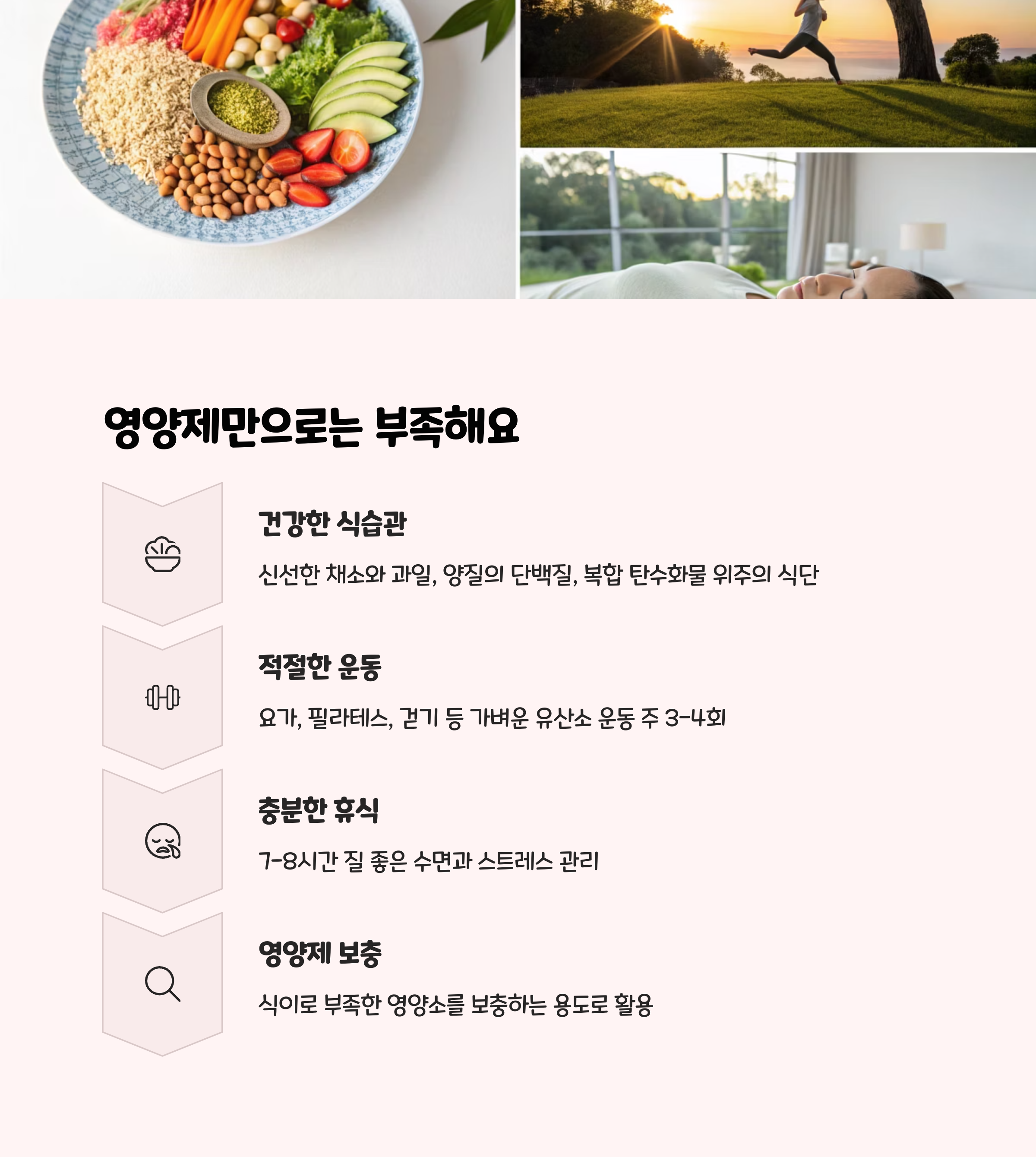 - 비타민, 미네랄 등은 복합적으로 섭취할 때 시너지 효과가 있으나, 개인 체질에 따라 부작용이 있을 수 있으니 복용 전 전문가 상담이 필요합니다.