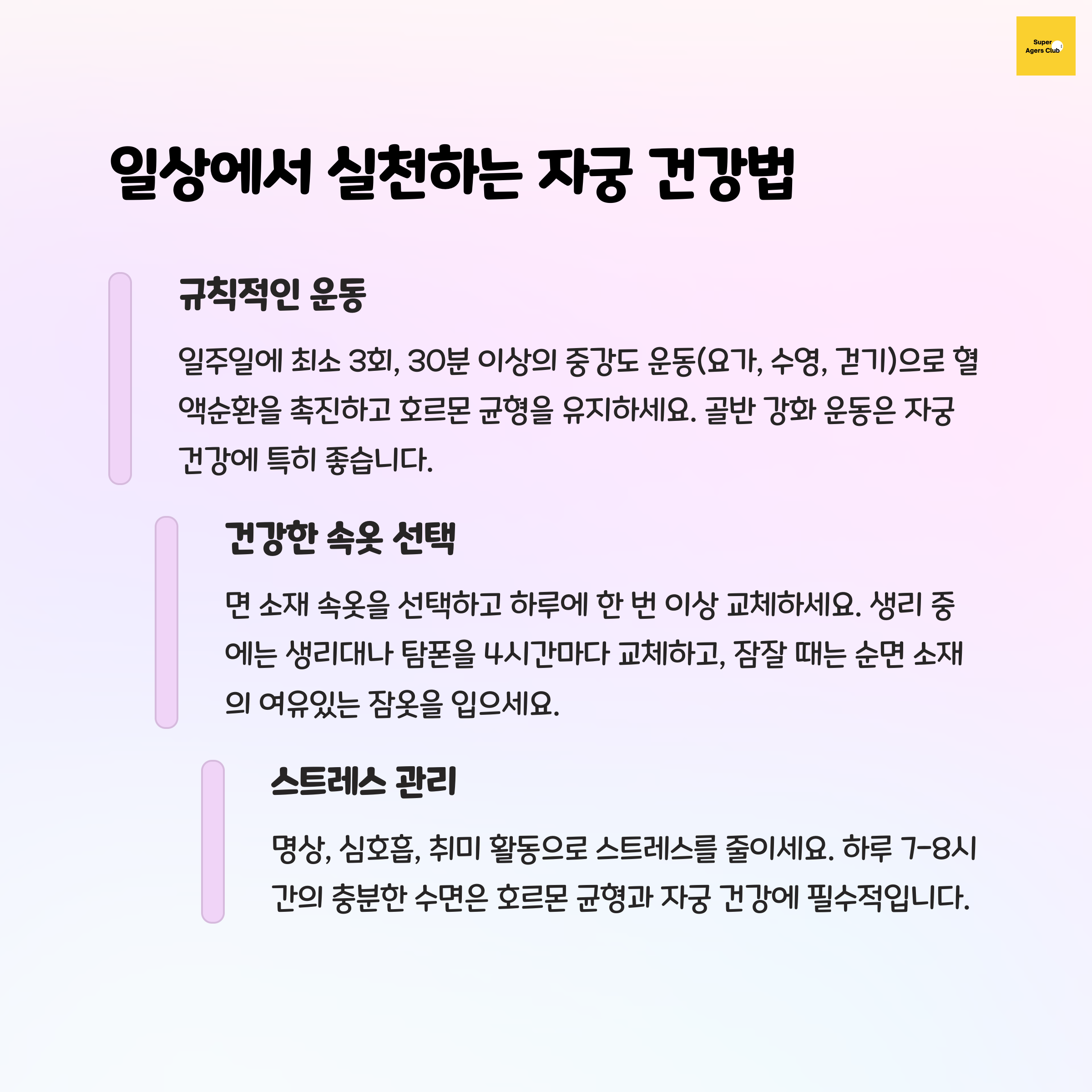 야근, 수면 부족, 과로는 여성호르몬 리듬을 깨뜨려 자궁 건강을 해칩니다. 반대로 규칙적인 운동은 체중 관리, 혈액순환 개선, 면역력 강화에 도움이 되어 자궁질환 예방에 필수적입니다.