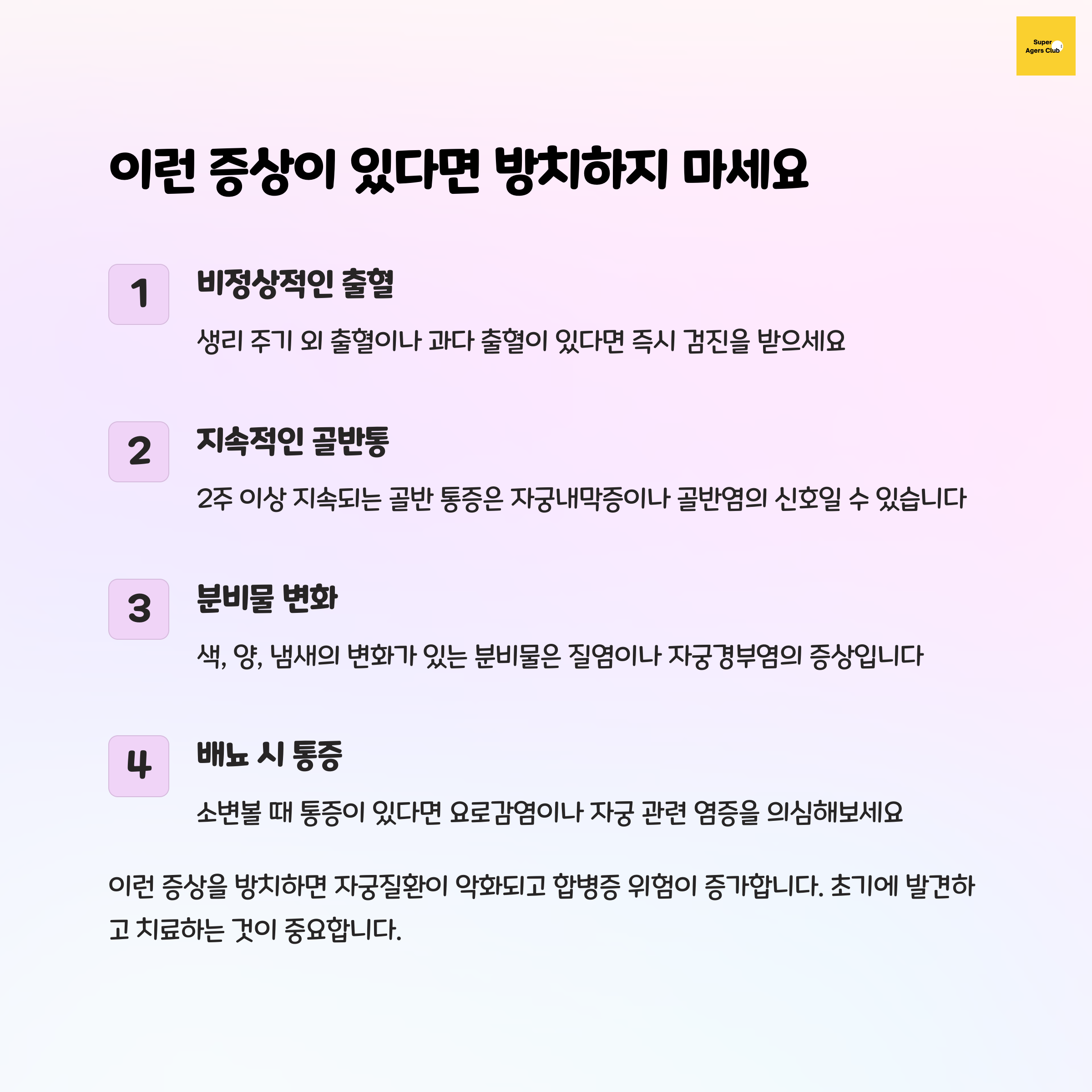 질염, 비정상 출혈, 분비물 변화, 골반통 등 초기 증상을 무시하면 만성 질환이나 합병증으로 악화될 수 있습니다. 증상이 반복된다면 즉시 산부인과 진료를 받아야 합니다.
