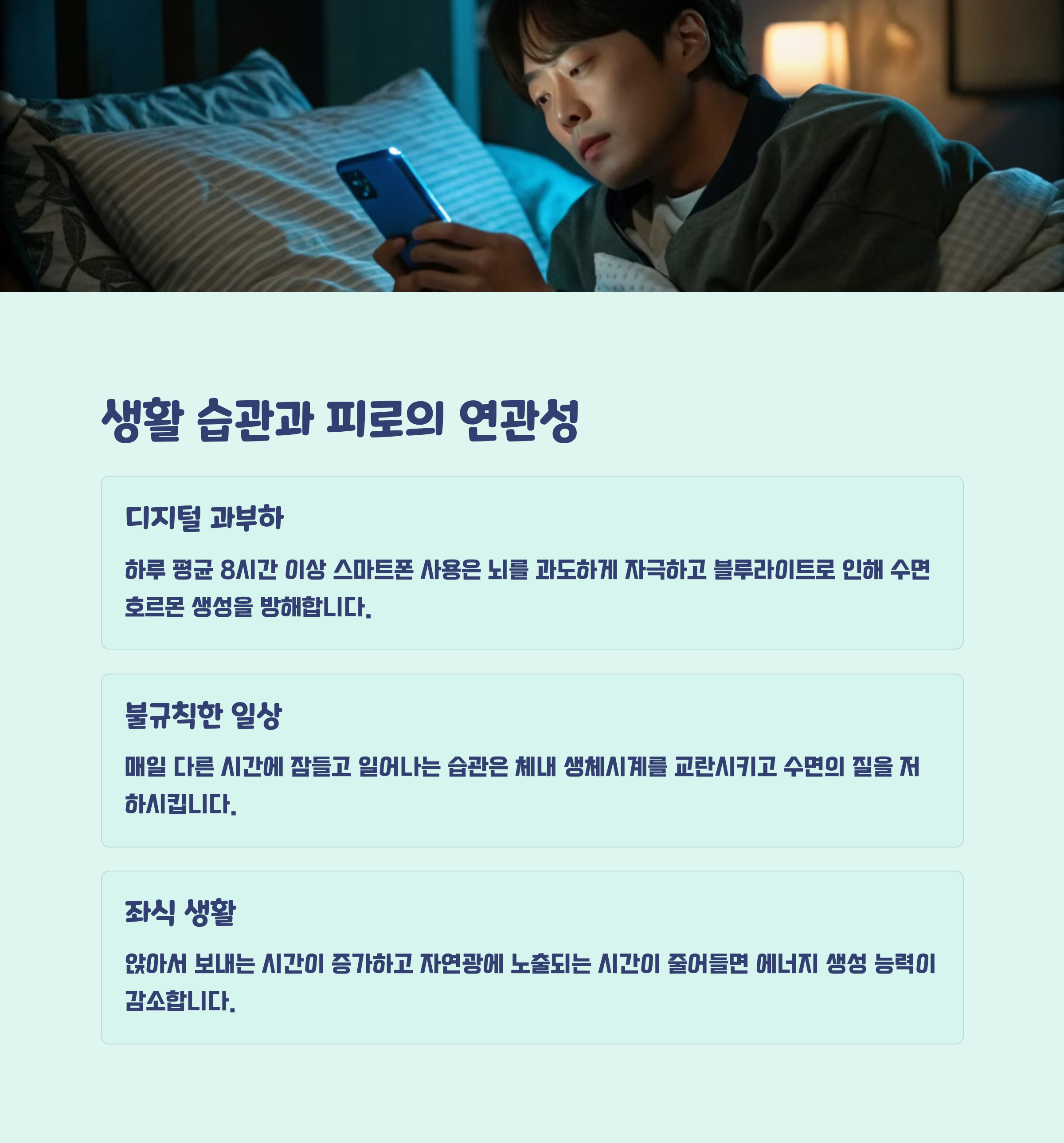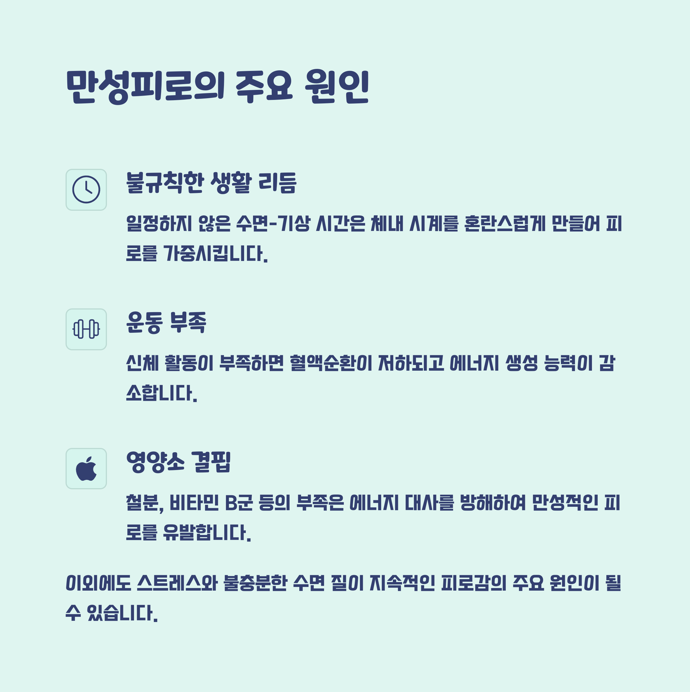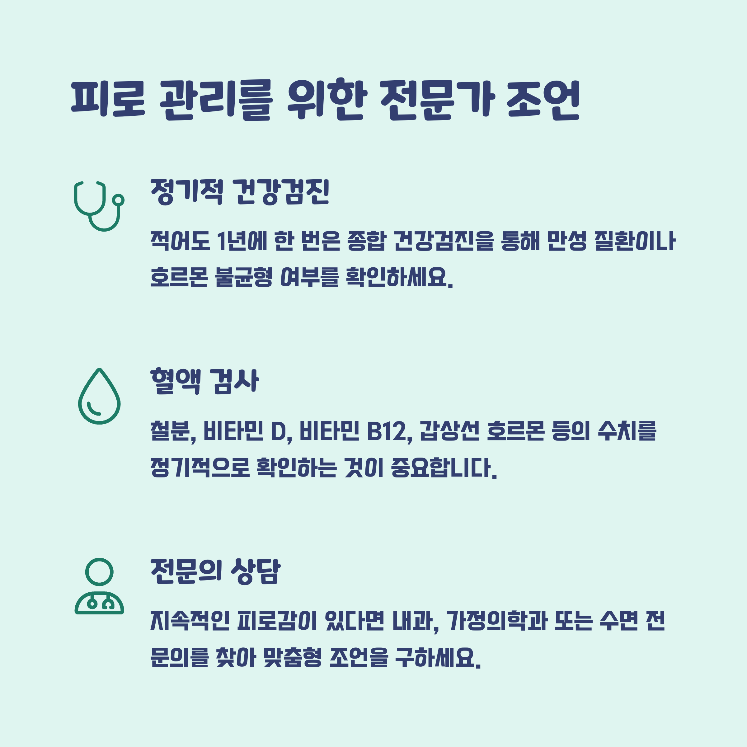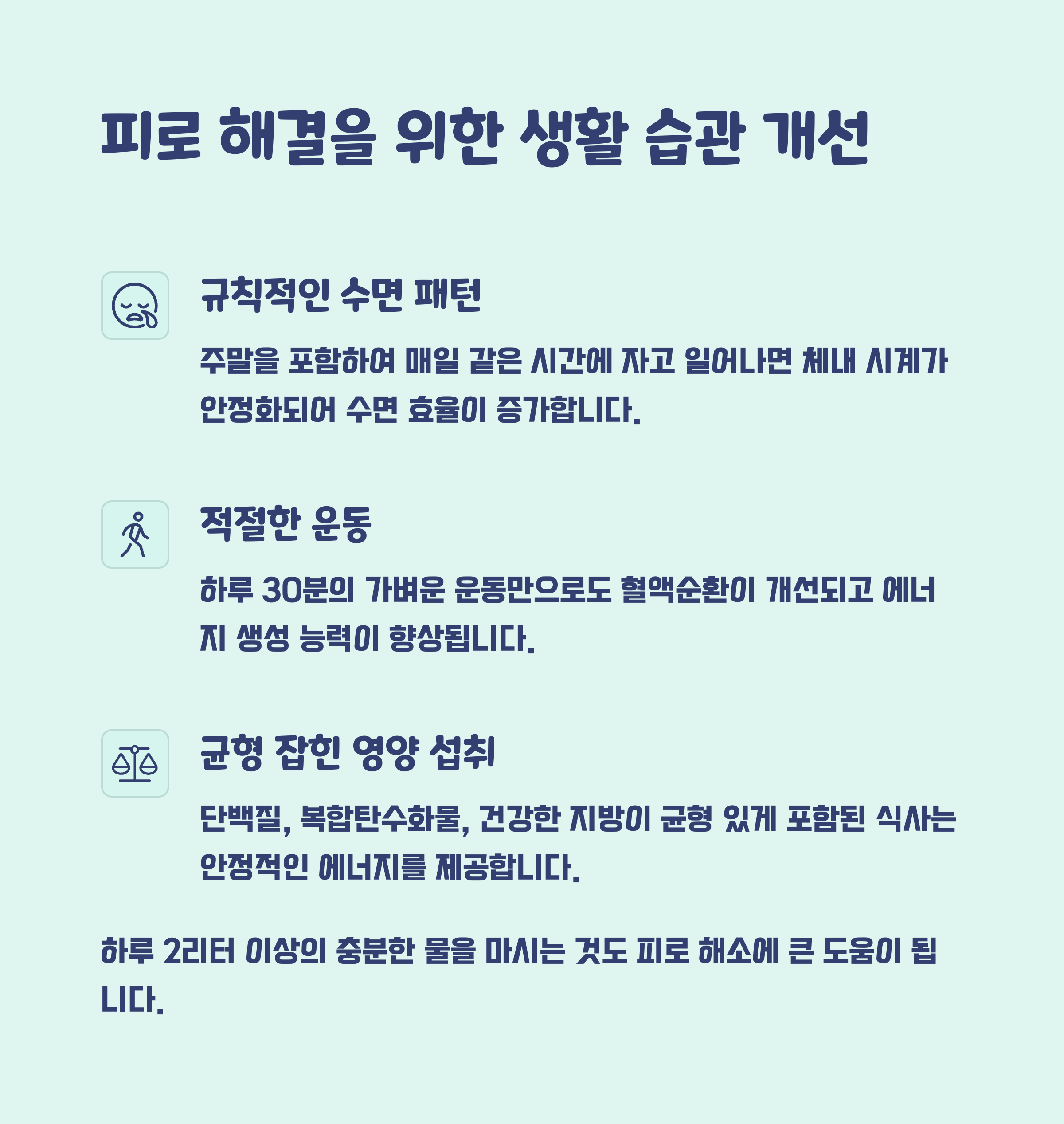 만약 이러한 방법으로도 피로가 지속된다면 만성 피로 증후군이나 다른 질환의 가능성을 고려해 전문가 상담을 받는 것이 좋습니다. 올바른 관리와 생활 습관 개선으로 더 활기차고 건강한 삶을 누릴 수 있을 것입니다.