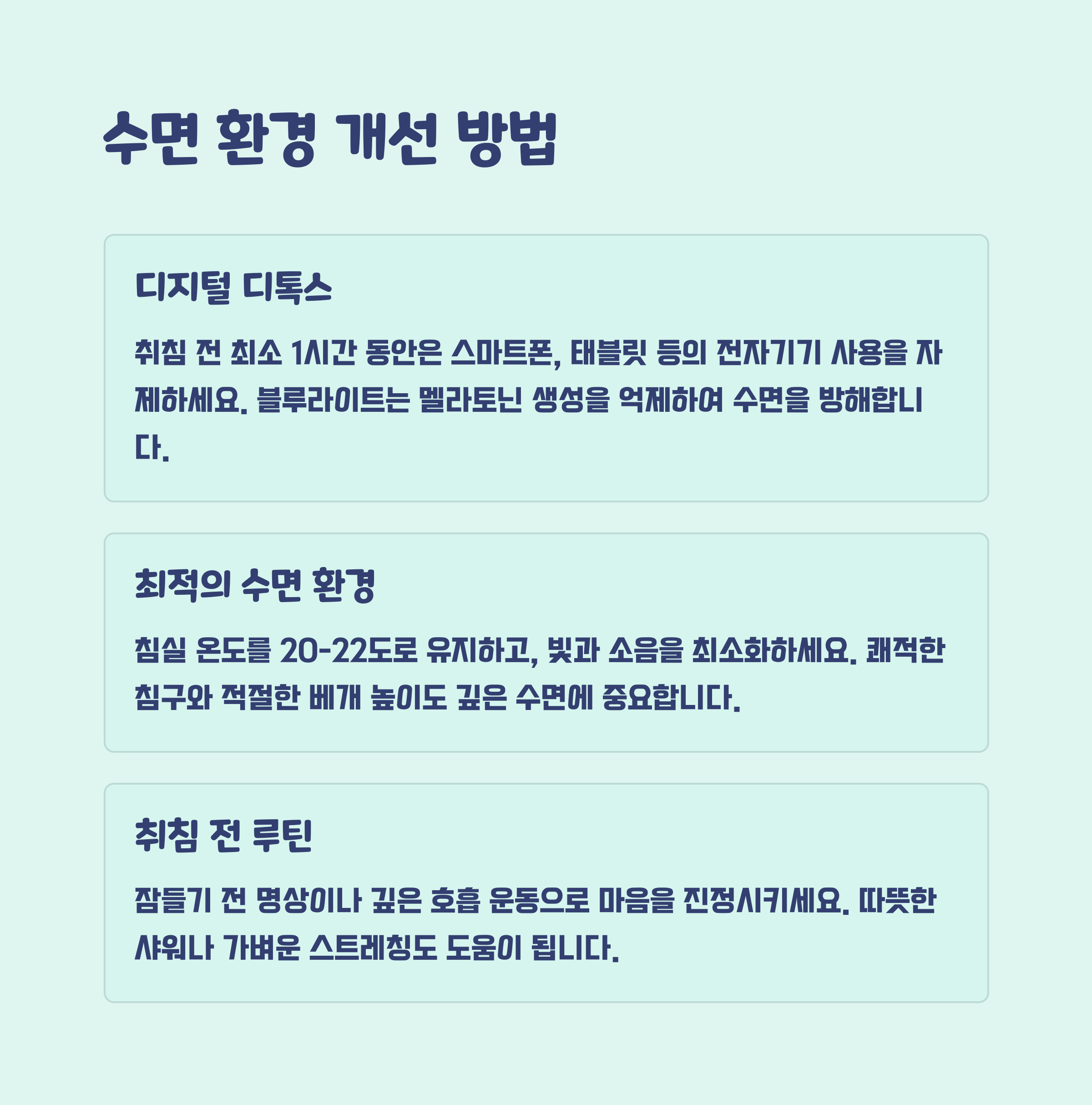 수면 환경은 숙면에 매우 중요한 요소입니다. 다음을 실천해 보세요.