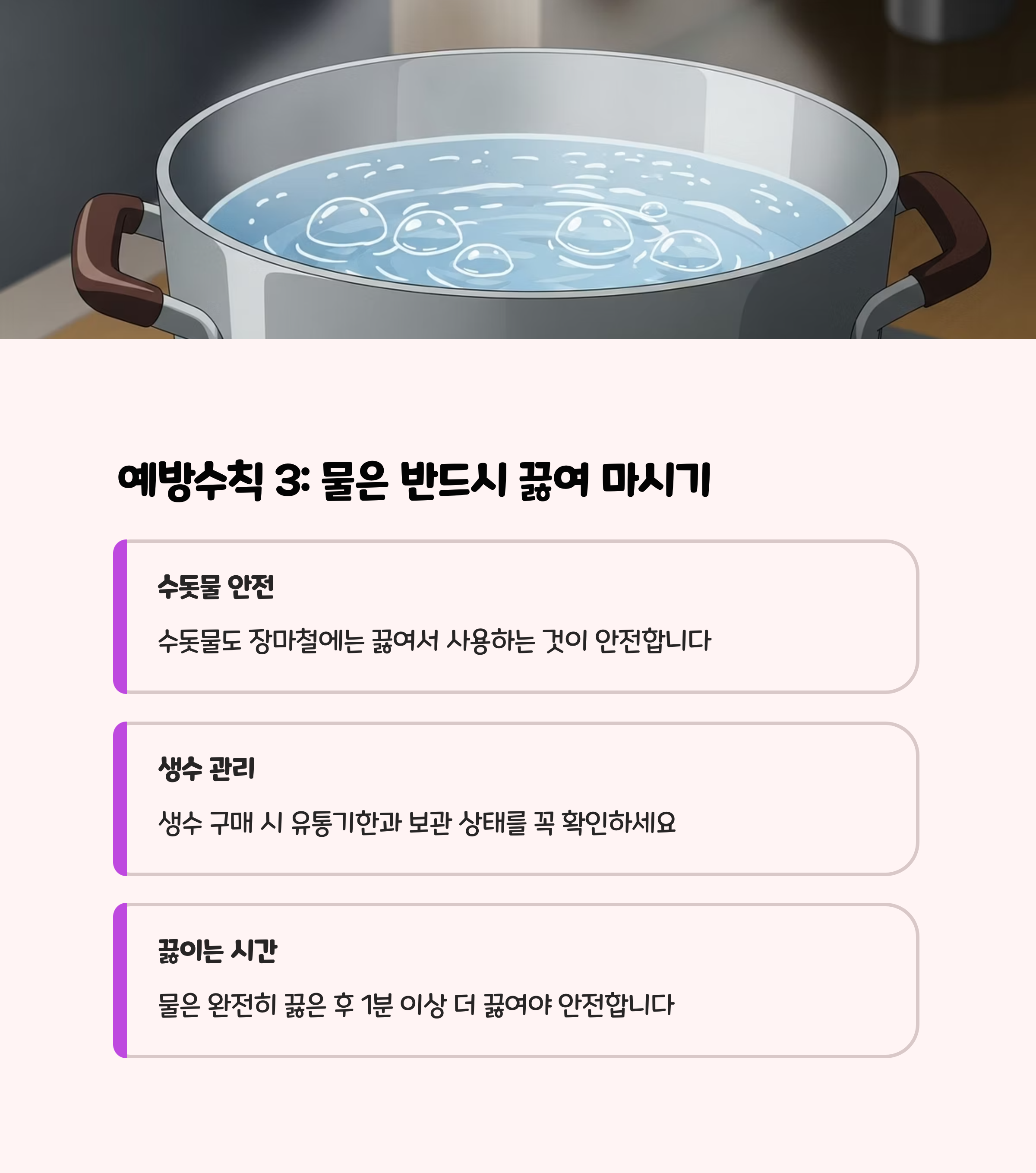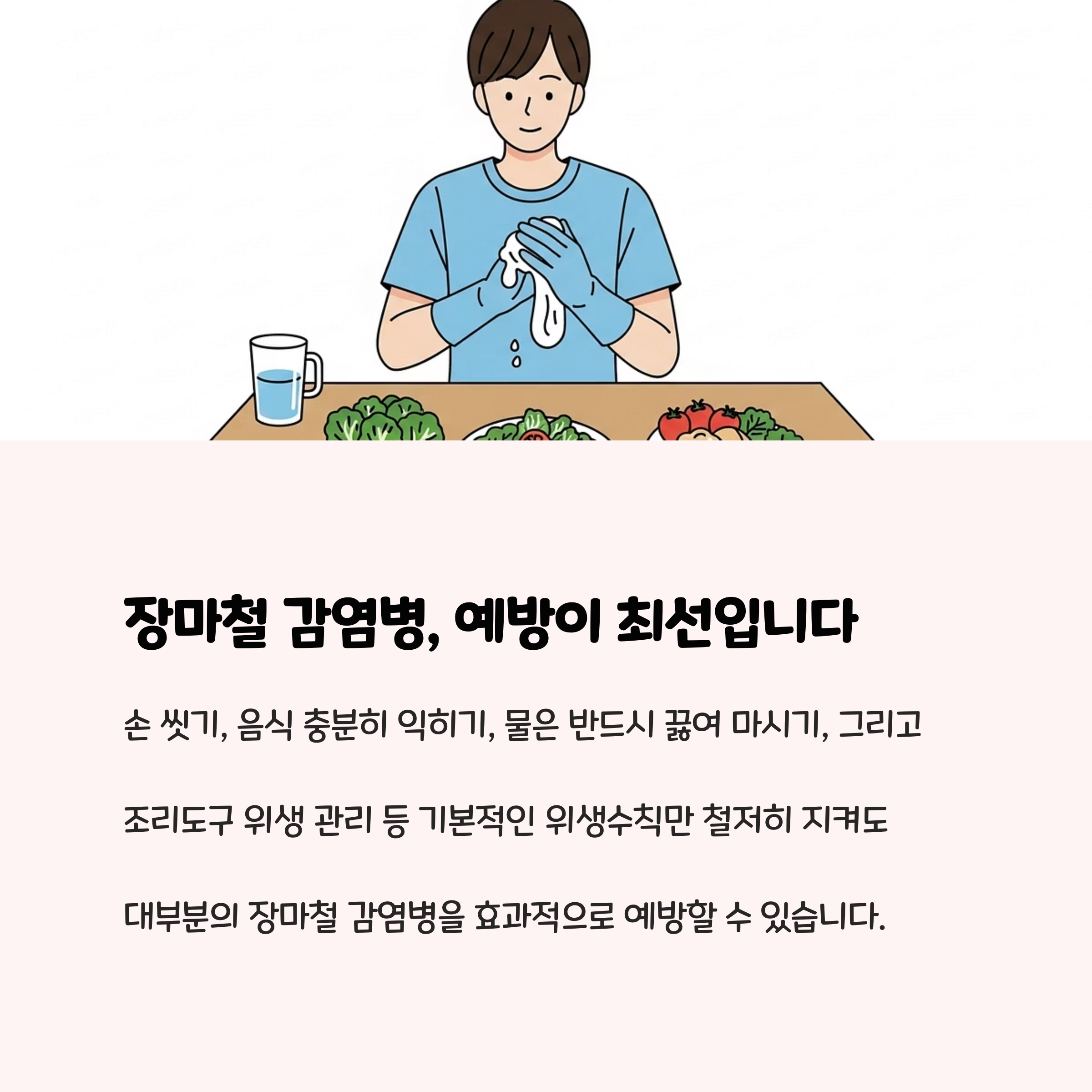 장마철에는 평소보다 감염병 위험이 높아지지만, 조금만 더 신경 쓰고 위생수칙을 실천하면 충분히 예방할 수 있습니다. 손 씻기, 음식 익혀 먹기, 깨끗한 물 사용 등 일상에서 실천 가능한 작은 습관들이 내 가족의 건강을 지키는 든든한 방패가 됩니다