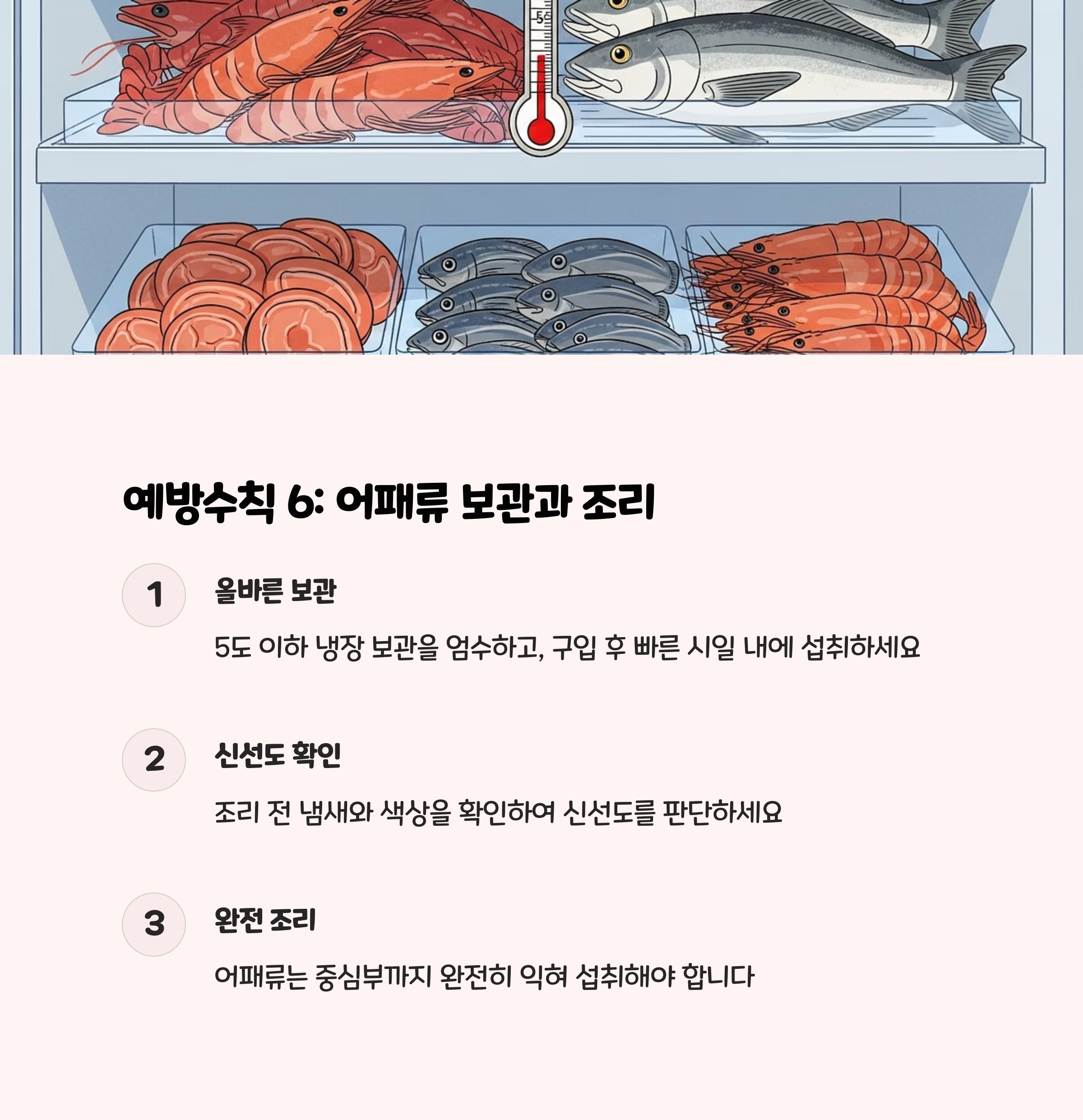 • 어패류는 5℃ 이하로 냉장 보관하고, 반드시 충분히 익혀서 섭취해야 합니다.