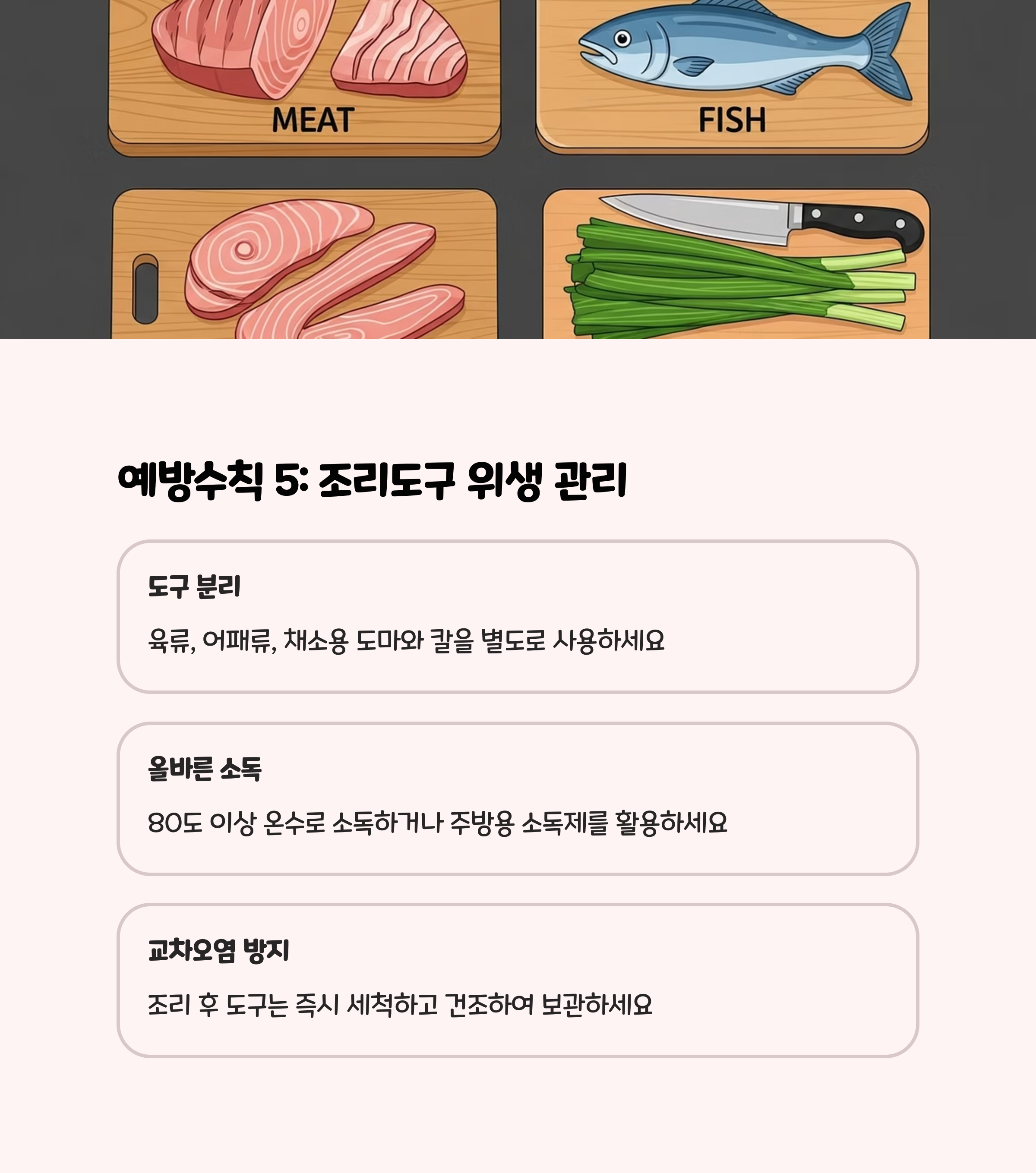 조리도구 관리 식재료별 분리 사용, 80℃ 이상 열탕 소독 칼, 도마, 행주 등