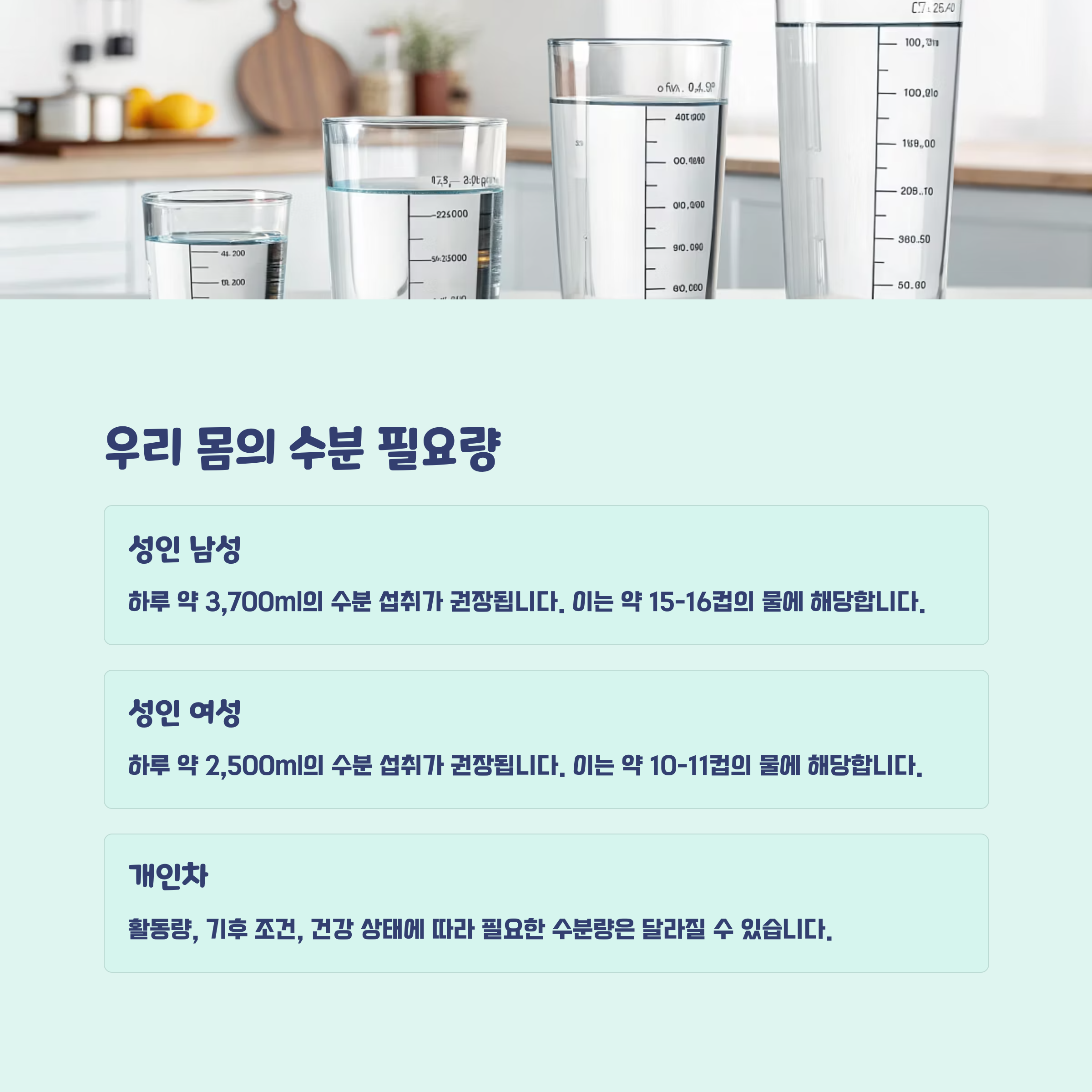 이 기준은 개인의 활동 수준, 체중, 날씨 조건에 따라 달라질 수 있습니다. 특히 더운 날씨나 운동 후에는 추가적인 수분 섭취가 필요합니다.