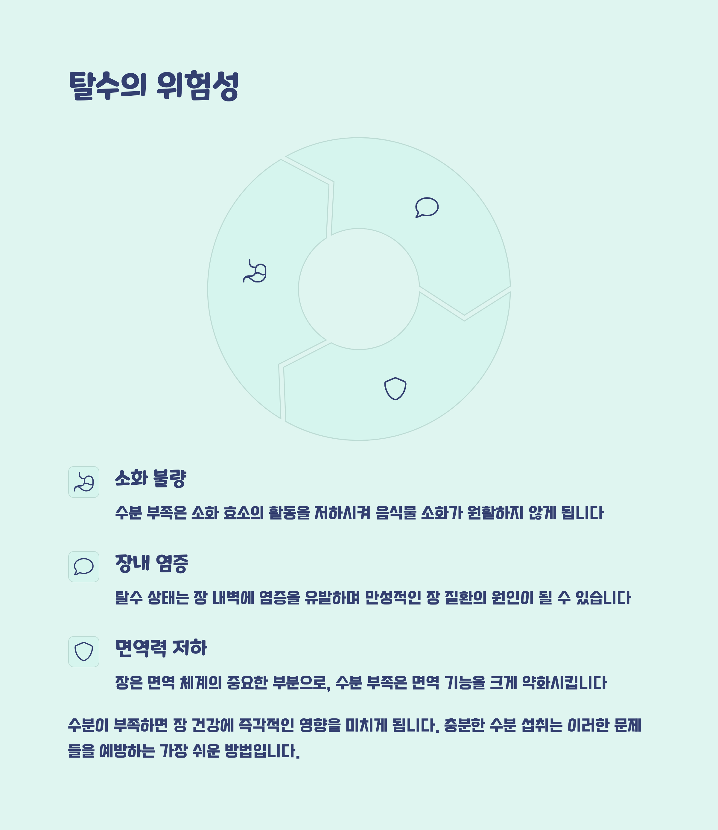 특히 탈수는 장 내 환경을 악화시켜 유해균이 증식할 가능성을 높입니다.