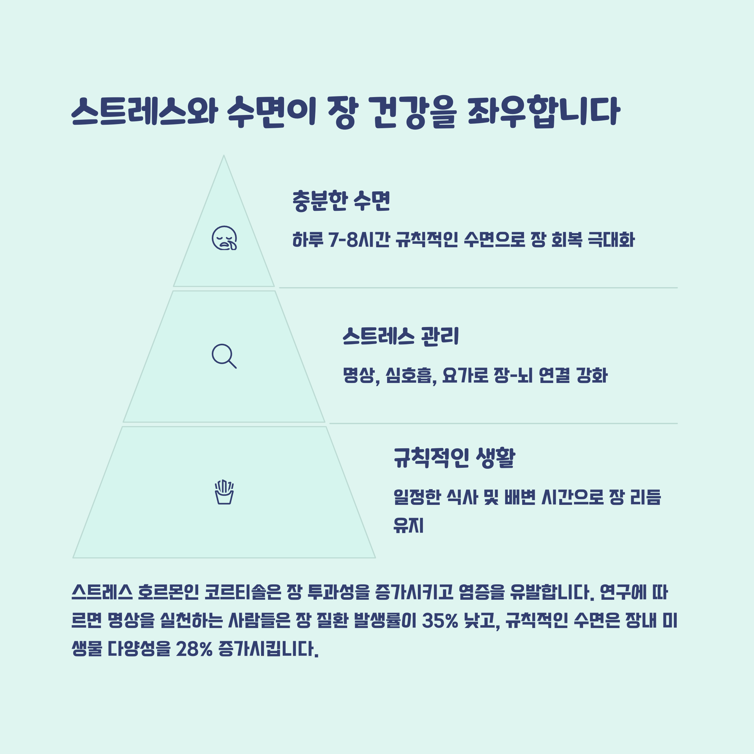 | 스트레스 관리 | 명상, 심호흡, 산책, 음악 듣기 | 뇌-장 신경망 안정, IBS 예방 |