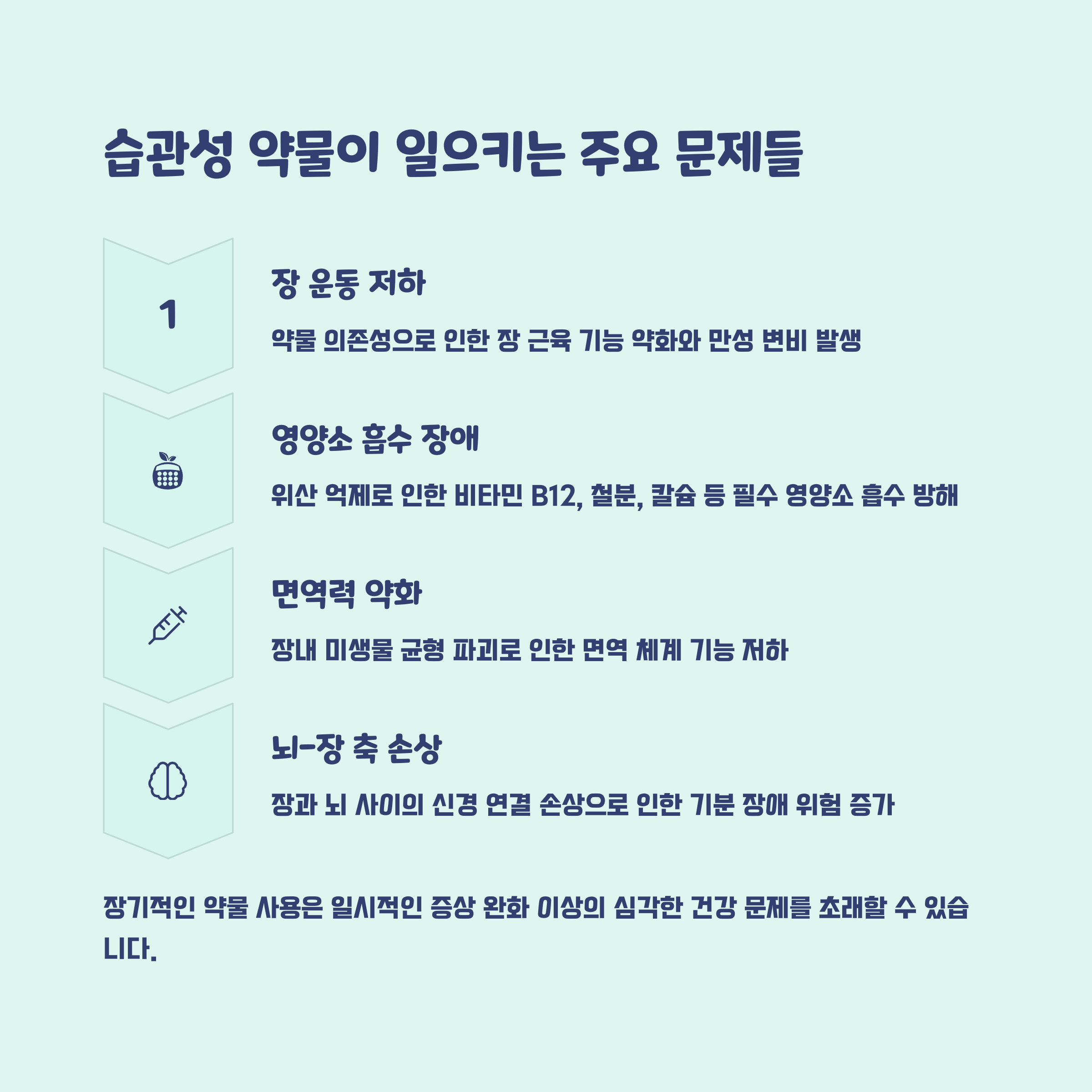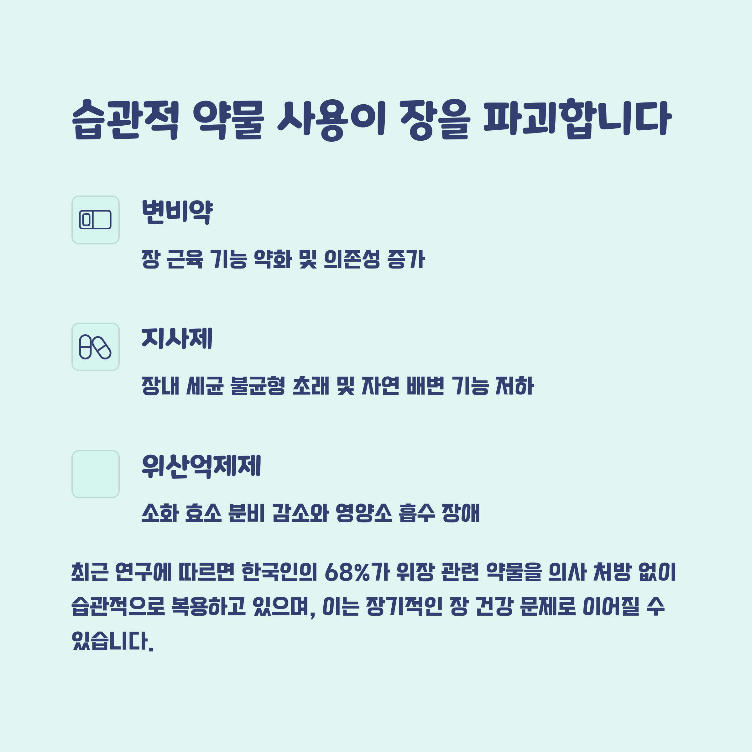 이처럼 습관적으로 약을 복용하면 장의 자연 회복력이 떨어지고, 오히려 증상이 악화되는 악순환에 빠질 수 있습니다.