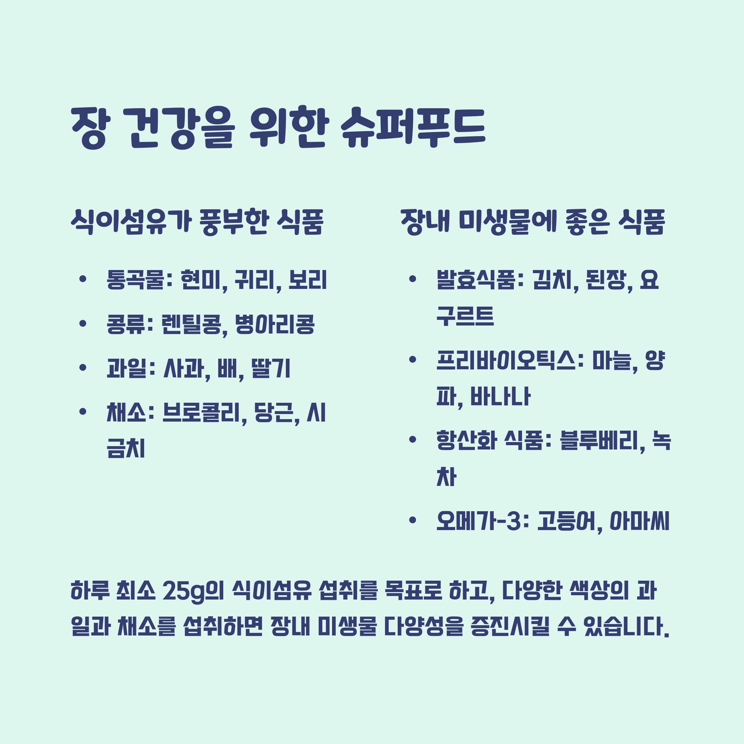 | 식이섬유 섭취 | 채소, 통곡물, 콩류, 발효식품 매일 섭취 | 유익균 증식, 배변 원활 |