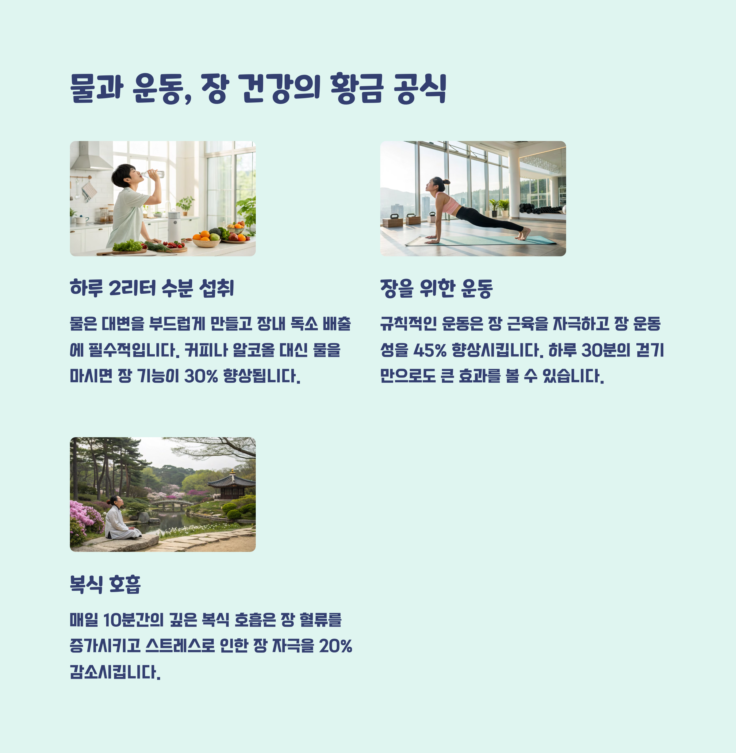 | 규칙적 운동 | 걷기, 스트레칭, 요가 등 주 3회 이상 | 장 연동운동 활성화 |