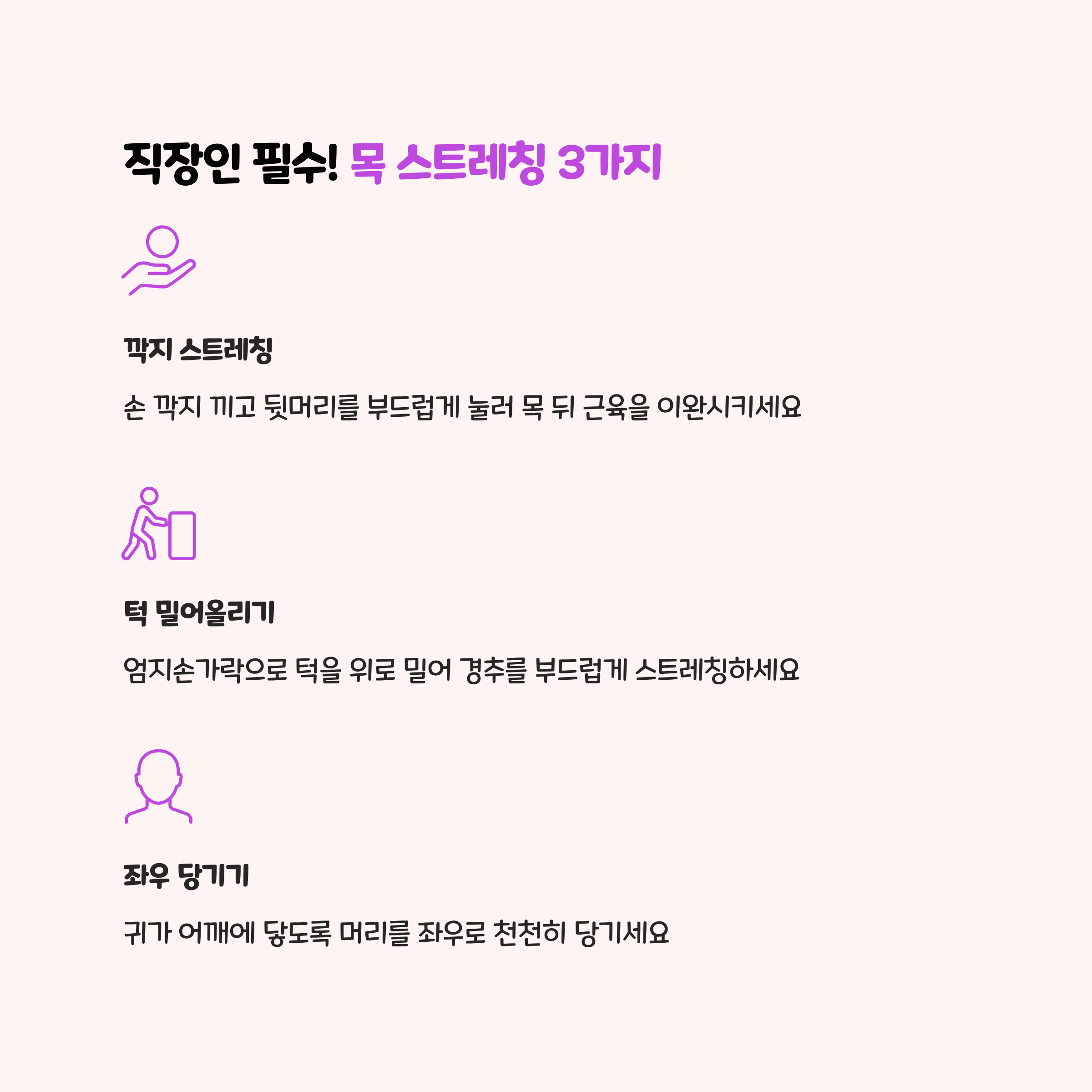 | 목 좌우 기울이기 | 의자에 앉아 머리를 천천히 왼쪽·오른쪽으로 기울이고 10초씩 유지 | 측면 목 근육 이완 |