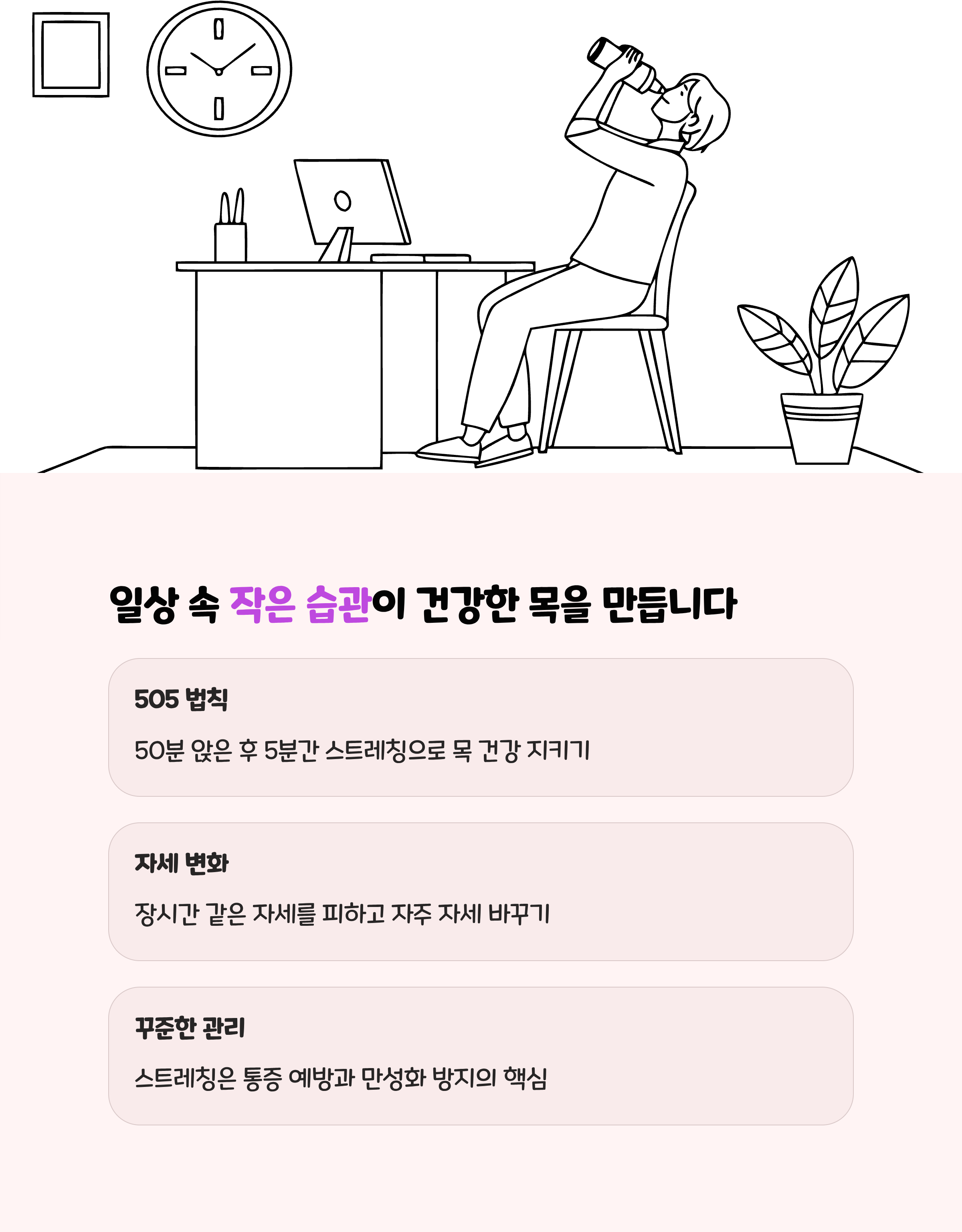 - 바른 자세 습관화: 모니터와 시선을 일직선으로, 턱을 내밀지 않기