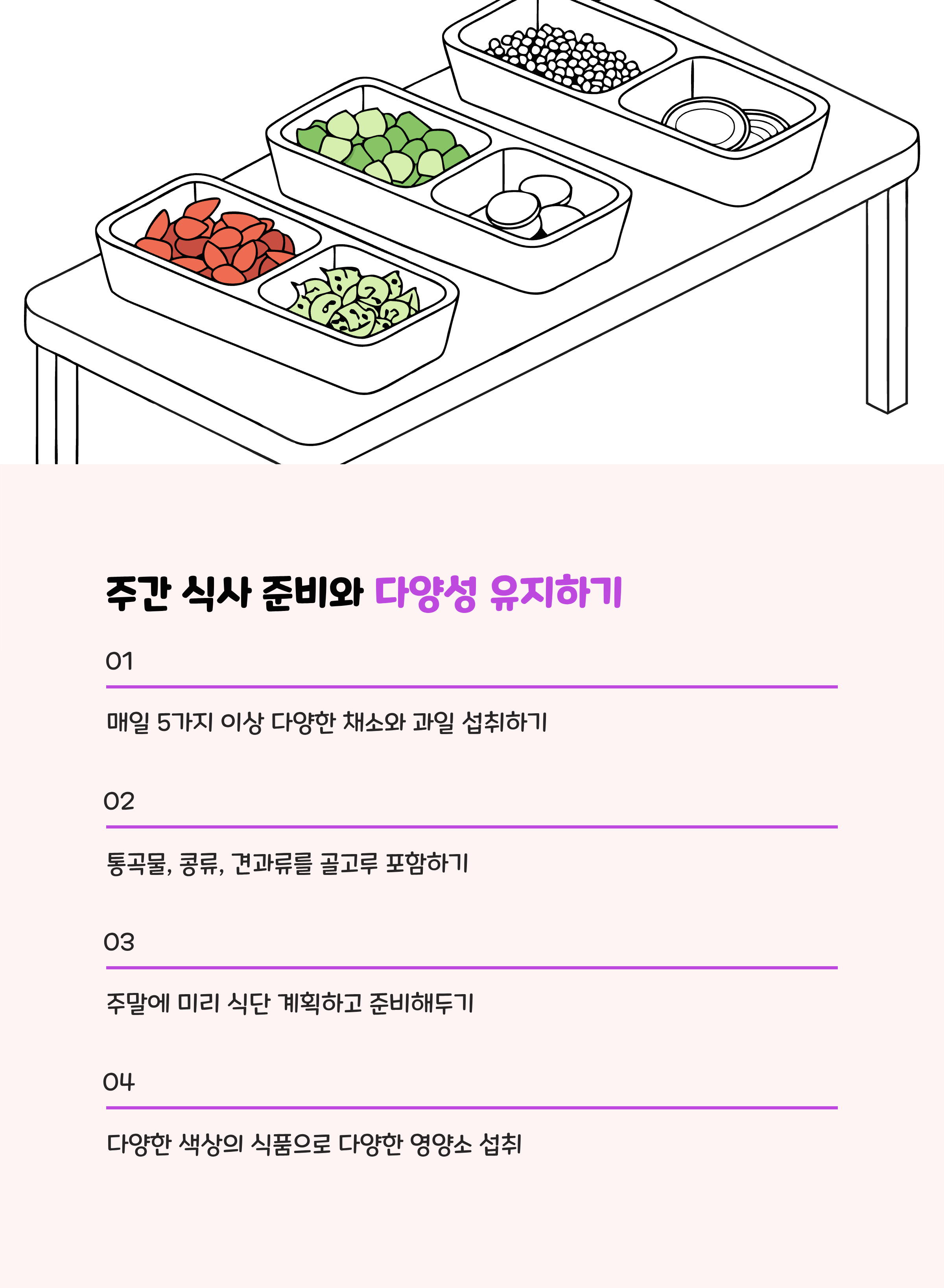 | 간식 | 무가당 요거트, 견과류, 당근 스틱, 허머스 | 프로바이오틱스, 건강한 지방, 비타민 |