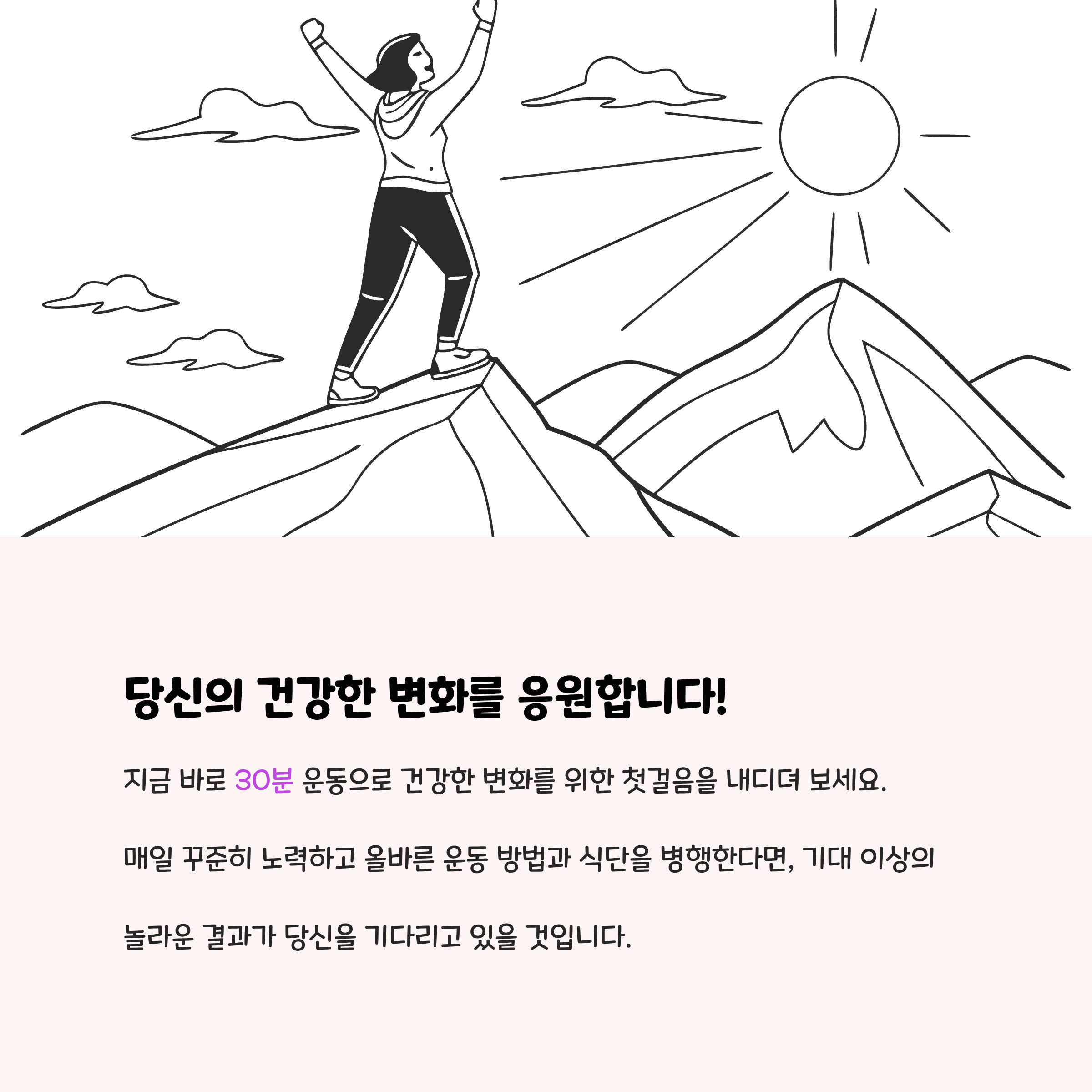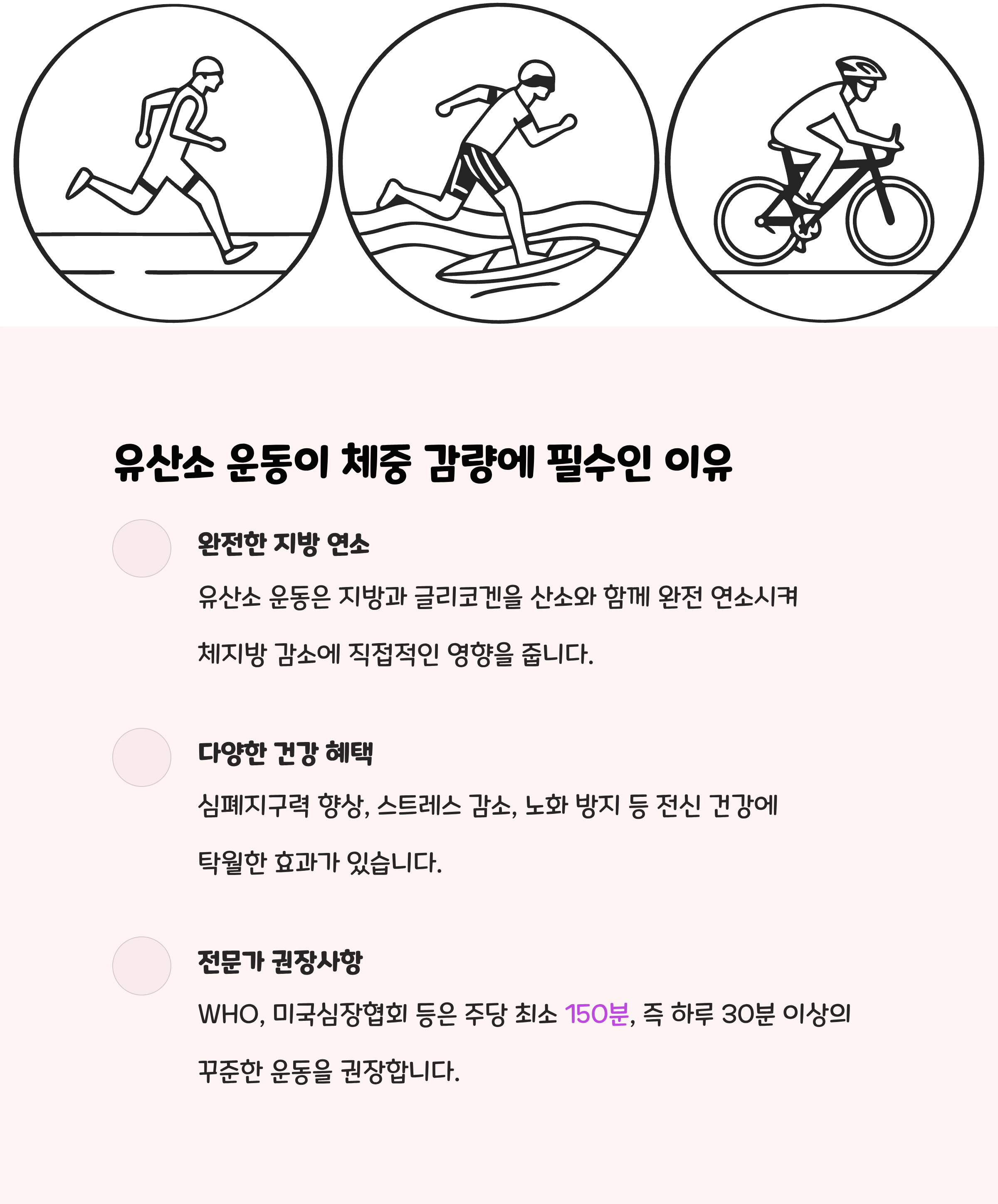 - 근력운동과 유산소 운동을 병행하여 기초대사량을 높이고 효율적인 체중 감량을 도모하세요.