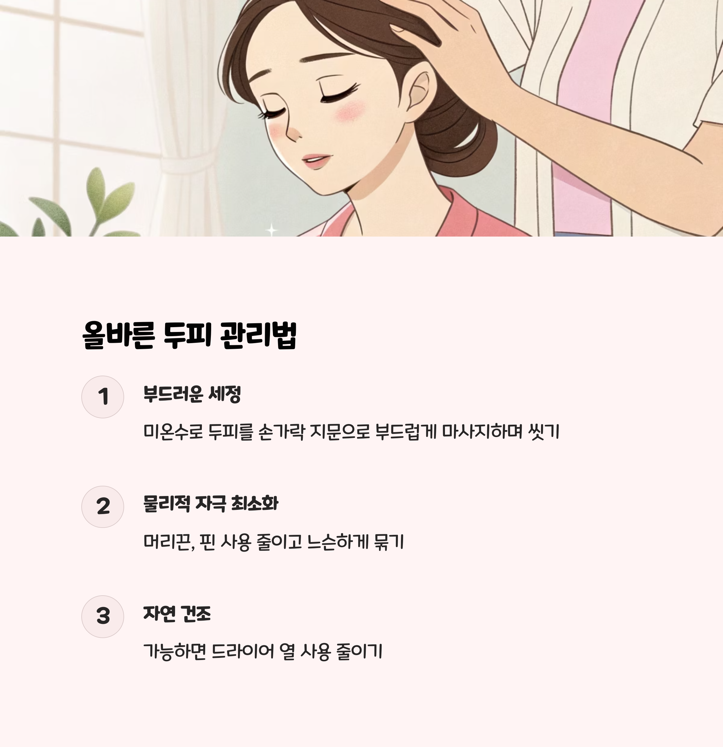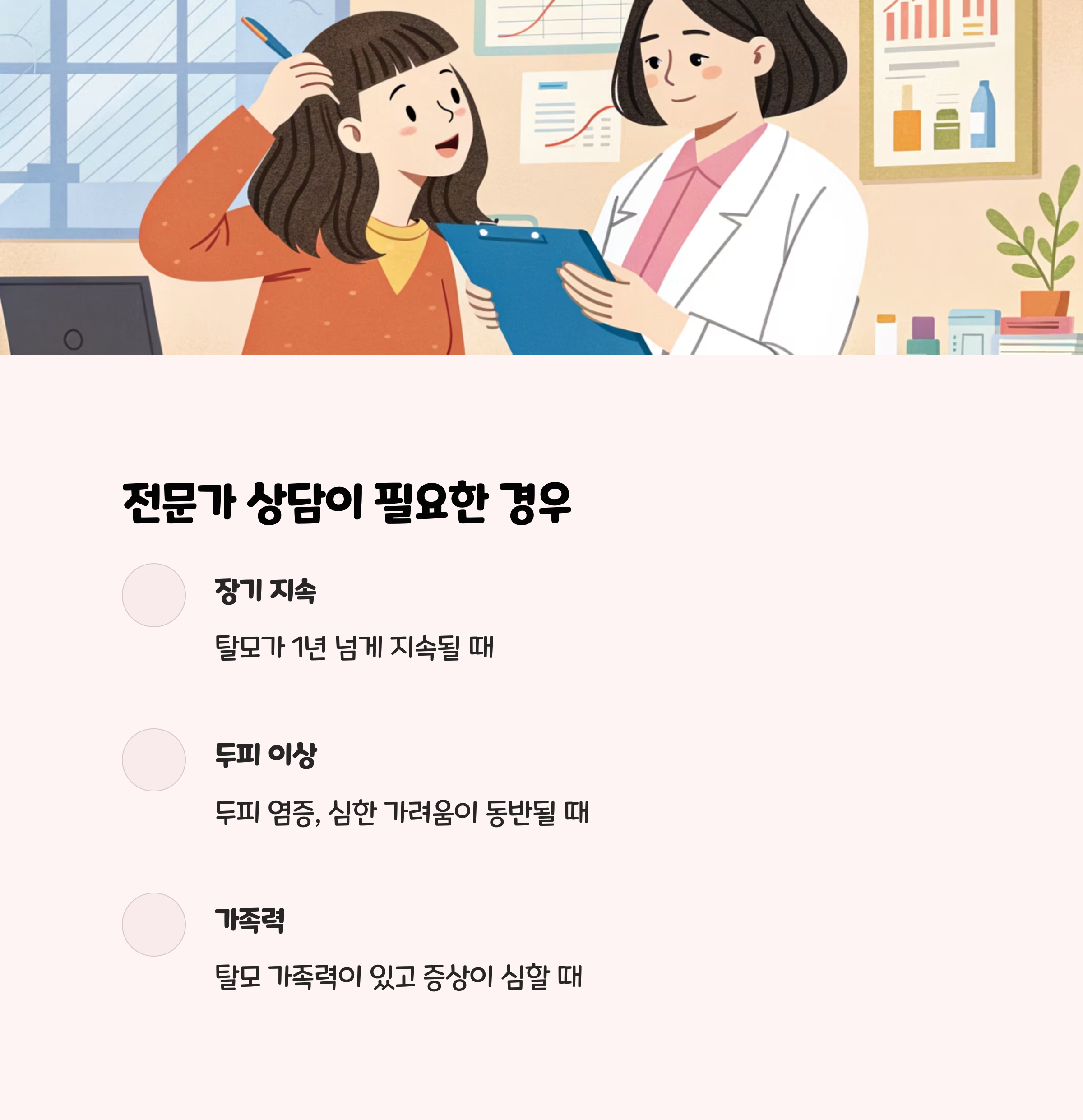 - 탈모가 1년 이상 지속되거나, 두피에 이상 증상이 나타난다면 피부과 또는 산부인과 전문의 상담을 받으세요.