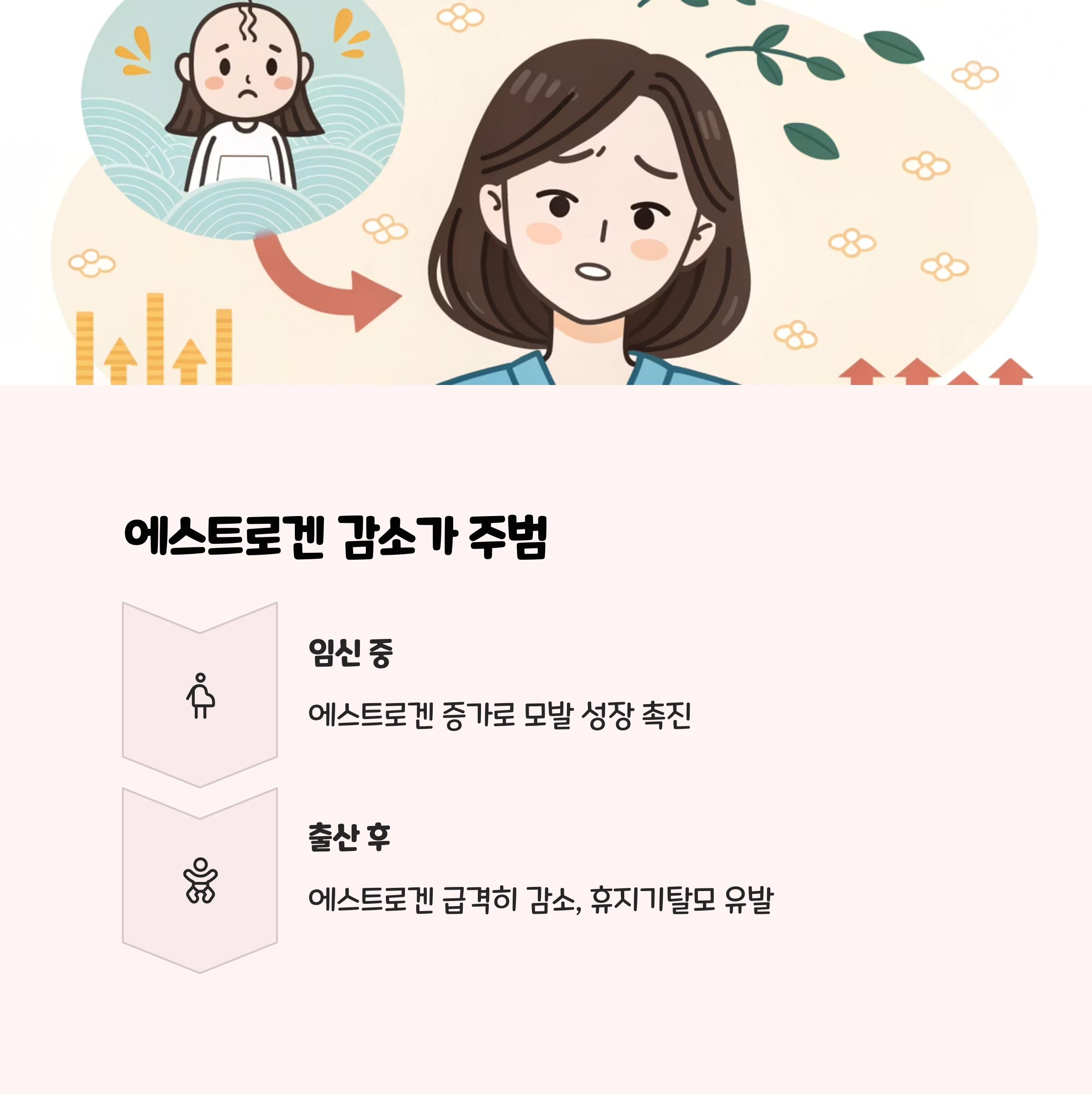 임신 기간 동안 여성의 몸에서는 에스트로겐이라는 호르몬이 평소보다 크게 증가합니다. 이 호르몬은 모발의 성장기를 연장시켜 머리카락이 잘 빠지지 않게 해줍니다. 하지만 출산 후에는 에스트로겐 수치가 급격히 감소하면서, 그동안 유지되던 머리카락이 한꺼번에 휴지기로 들어가 대량으로 빠지는 현상이 나타납니다. 이를 산후 휴지기 탈모라고 부르며, 보통 출산 후 2~4개월 사이에 시작되어 6~9개월까지 지속되는 경우가 많습니다.