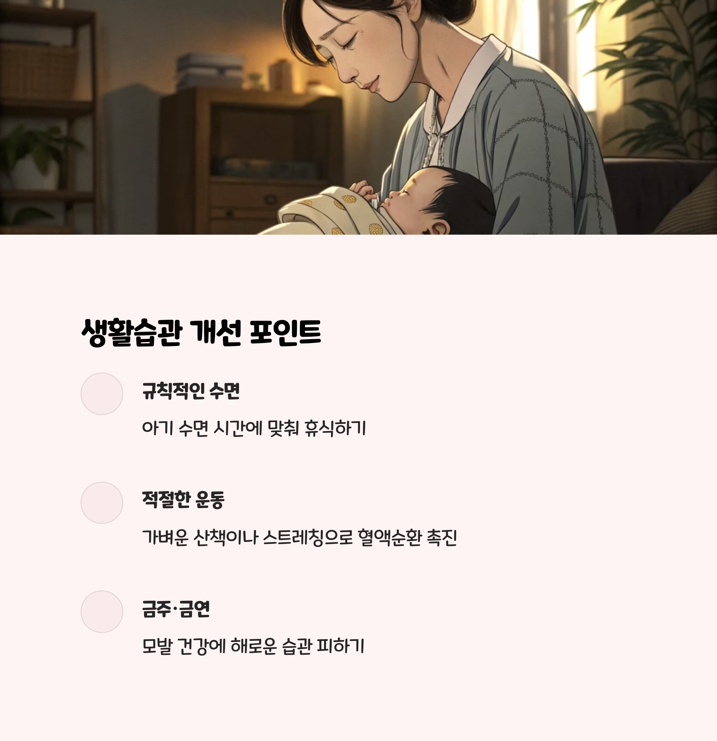 출산 후 갑자기 머리카락이 한 움큼씩 빠지는 경험, 당황스럽고 걱정되시죠? 많은 엄마들이 겪는 이 문제는 단순히 시간이 지나면 괜찮아질 거라며 넘기기엔 심리적으로 큰 부담이 될 수 있습니다. 하지만 원인을 정확히 알고, 집에서 실천할 수 있는 관리법을 꾸준히 적용한다면 탈모로 인한 스트레스도 줄이고 건강한 모발을 회복할 수 있습니다. 오늘은 출산 후 여성 탈모의 주요 원인과 집에서 실천할 수 있는 효과적인 관리법을 자세히 안내합니다.