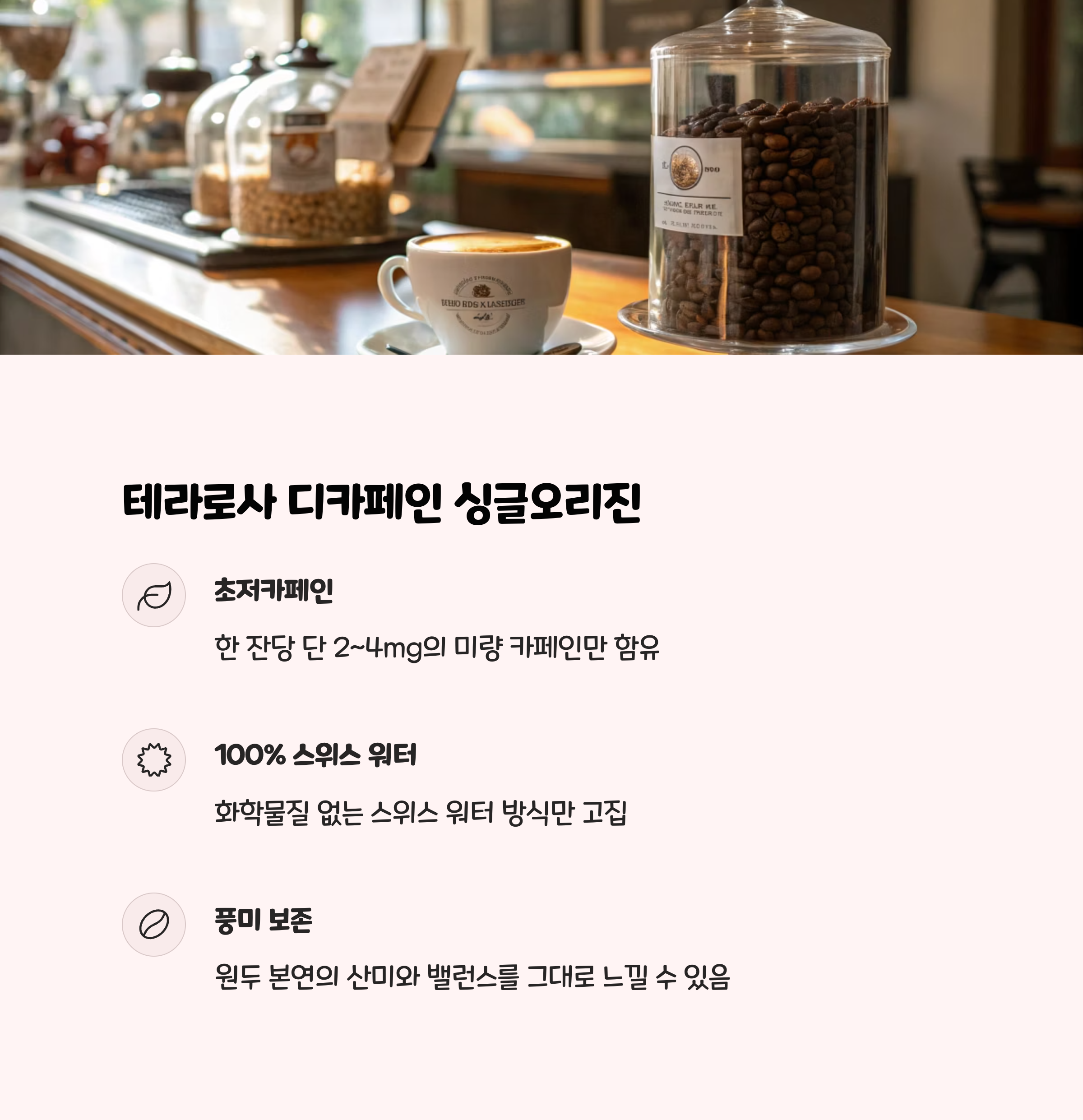 | 테라로사 | 디카페인 원두 | 2~5mg | 스위스 워터 프로세스 | 신선한 풍미, 프리미엄 스페셜티 |