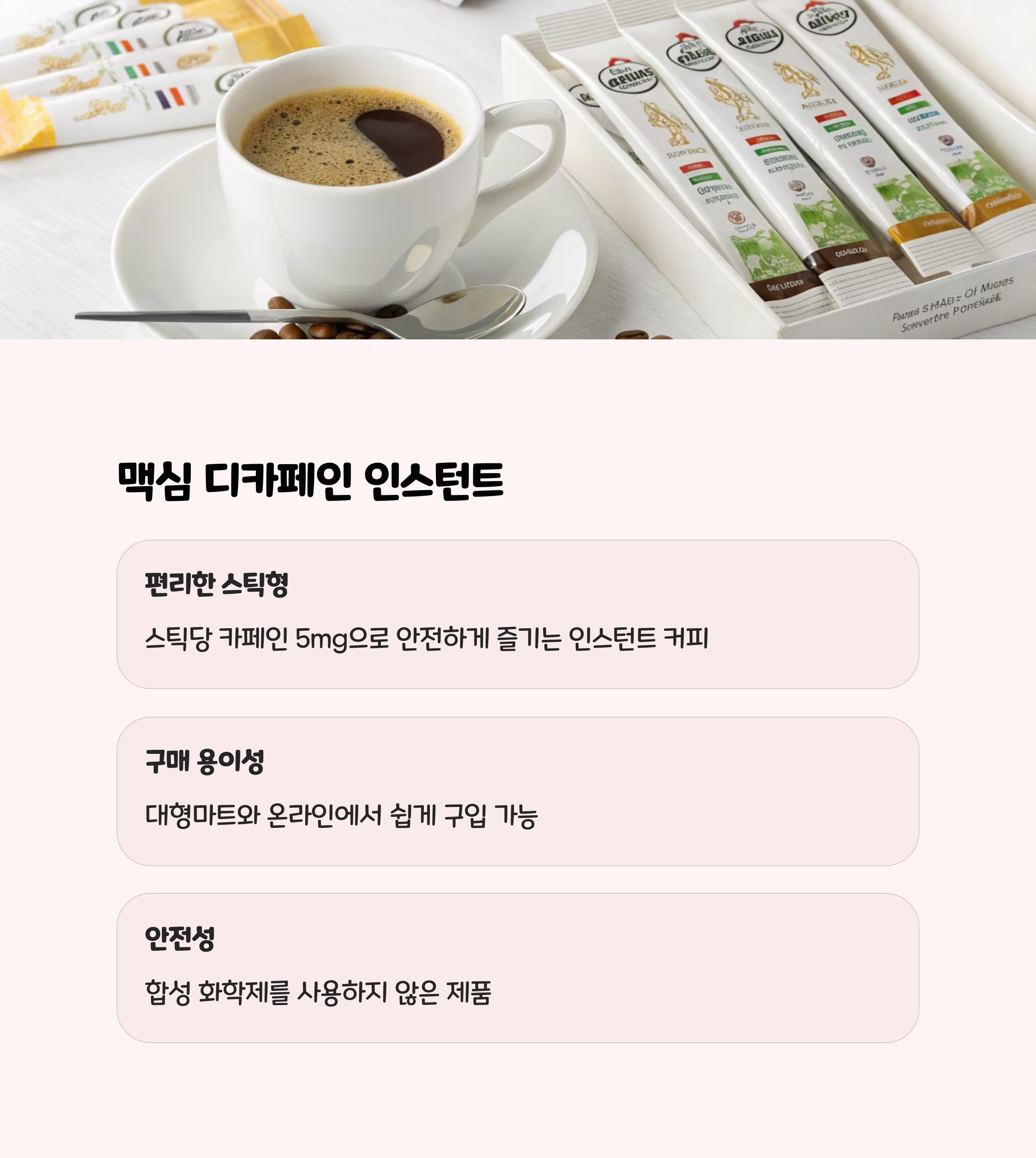 | 맥심 | 디카페인 커피믹스 | 2~5mg | 화학 용매 방식 | 고소하고 달콤, 간편함 |