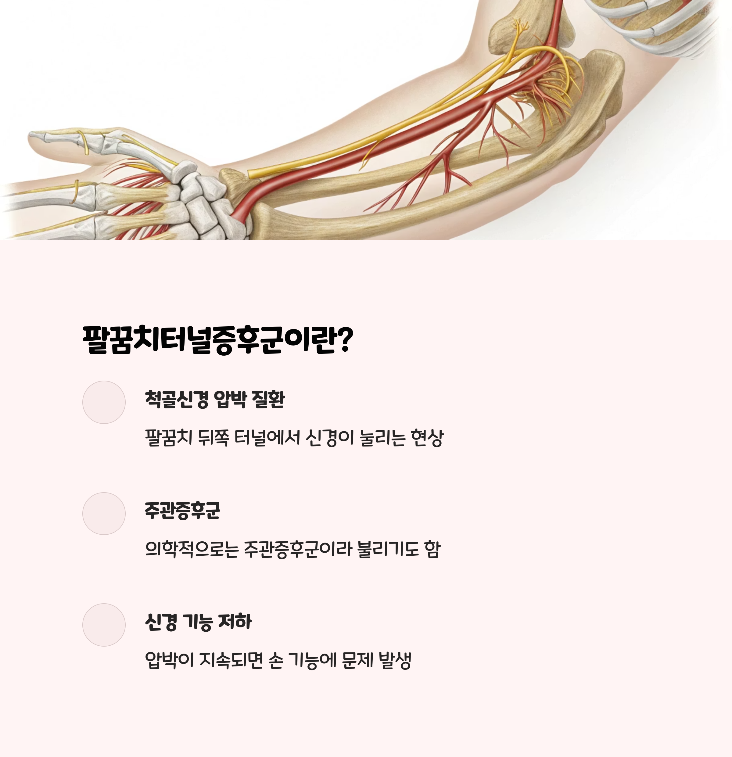 주요 증상: 팔꿈치 통증과 함께 팔 전체, 손까지 저림.특징: 경추 신경이 눌릴 때 발생하며, 팔꿈치터널증후군과 감별이 필요함.