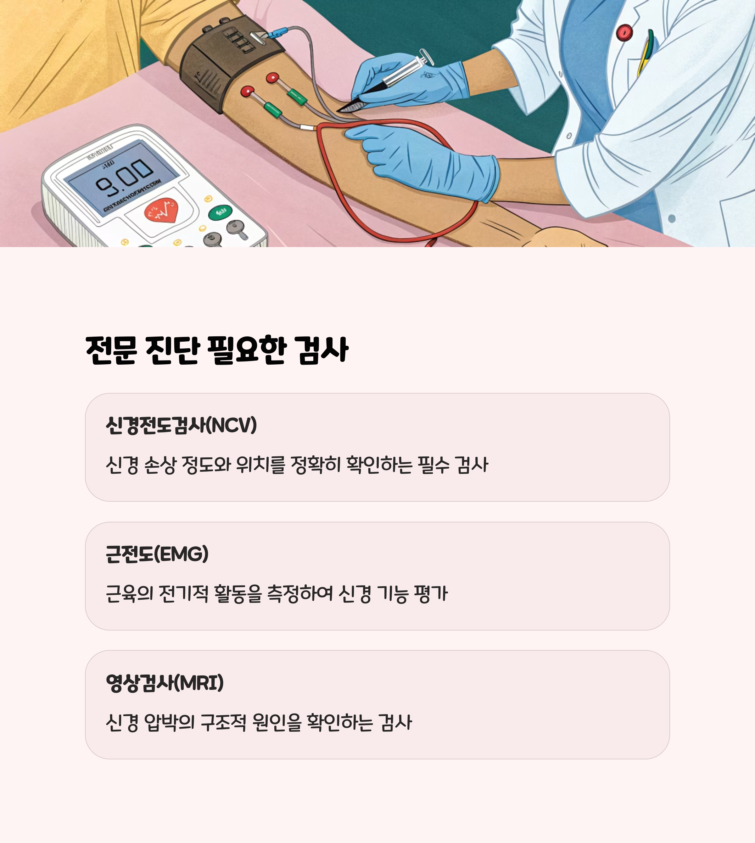 이런 경우 반드시 신경과 또는 정형외과 전문의 진료를 받아야 하며, 신경전도검사, 근전도, MRI 등 정확한 검사가 필요합니다.