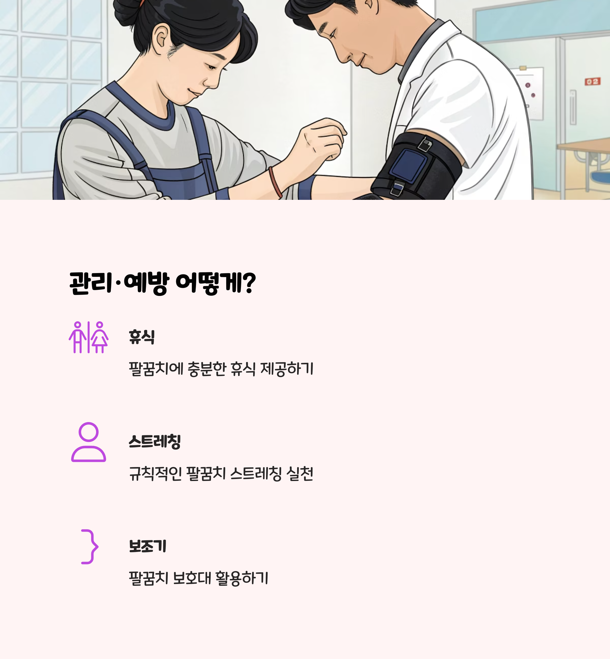 팔꿈치 과사용 자제: 반복적인 팔꿈치 굴곡, 무거운 물건 들기, 장시간 컴퓨터·스마트폰 사용을 피하세요.자세 교정: 팔베개, 턱 괴기, 팔을 구부린 채로 오래 있는 습관은 신경 압박을 유발하므로 바른 자세를 유지합니다.적절한 휴식과 스트레칭: 팔꿈치 주변 근육을 풀어주는 스트레칭과 충분한 휴식이 중요합니다.보조기 착용: 수면 시 팔꿈치를 편 상태로 고정하는 부목 사용이 도움이 됩니다.