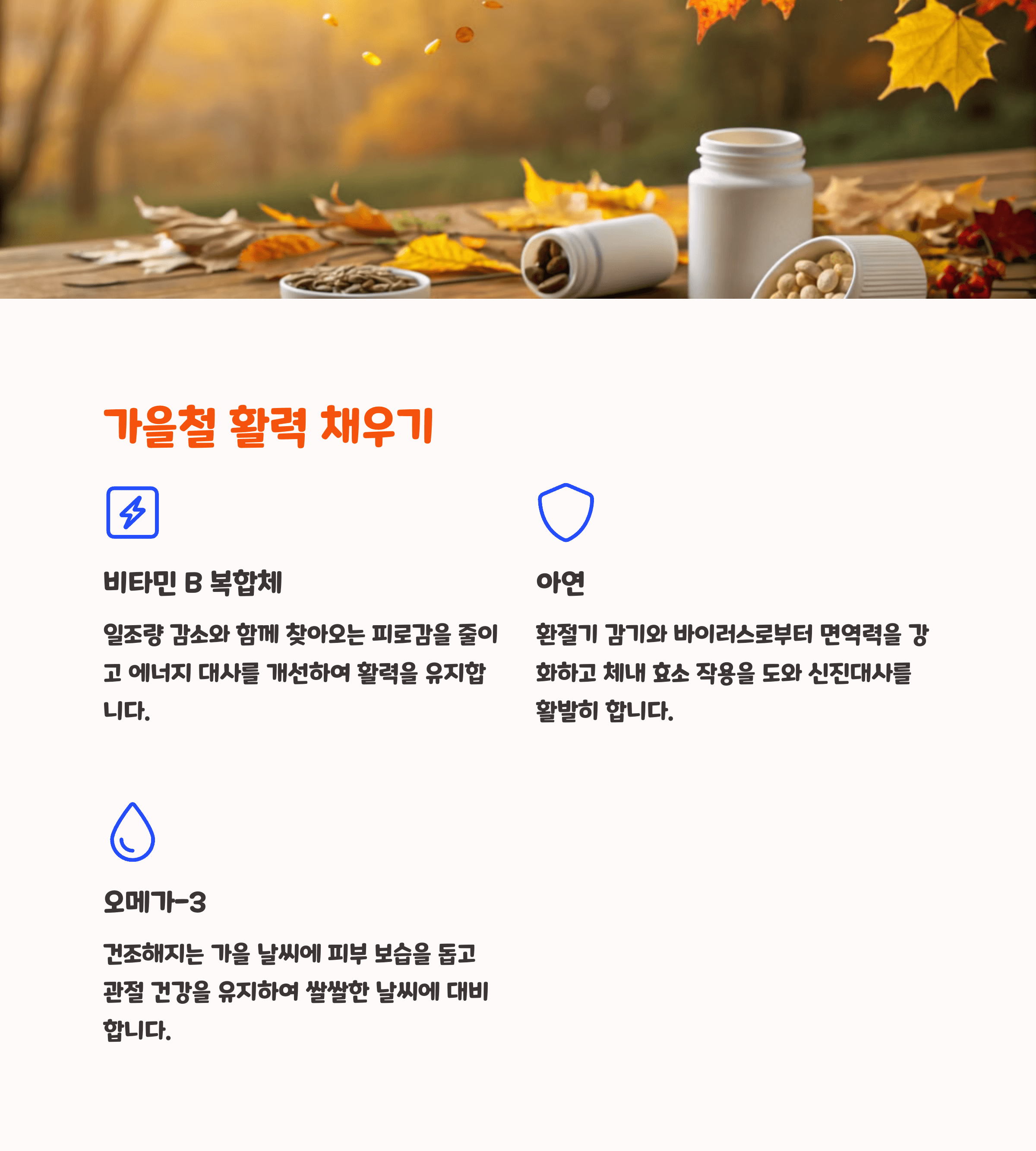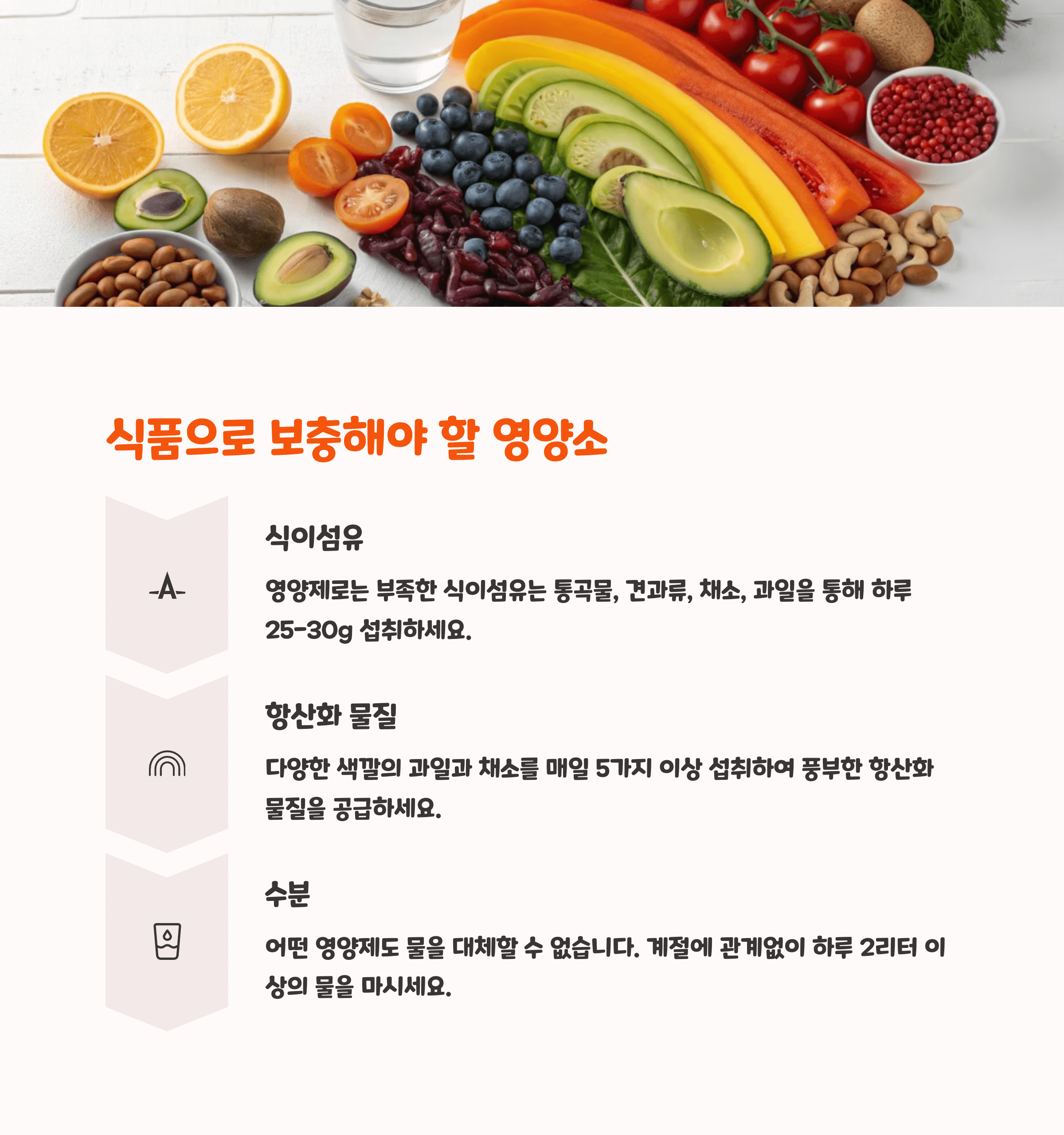 여러분은 계절별로 어떤 영양제를 챙겨 드시나요? 추천하는 영양제가 있다면 댓글로 공유해 주세요! 건강한 생활을 위해 서로의 정보를 나누는 공간이 되었으면 합니다.