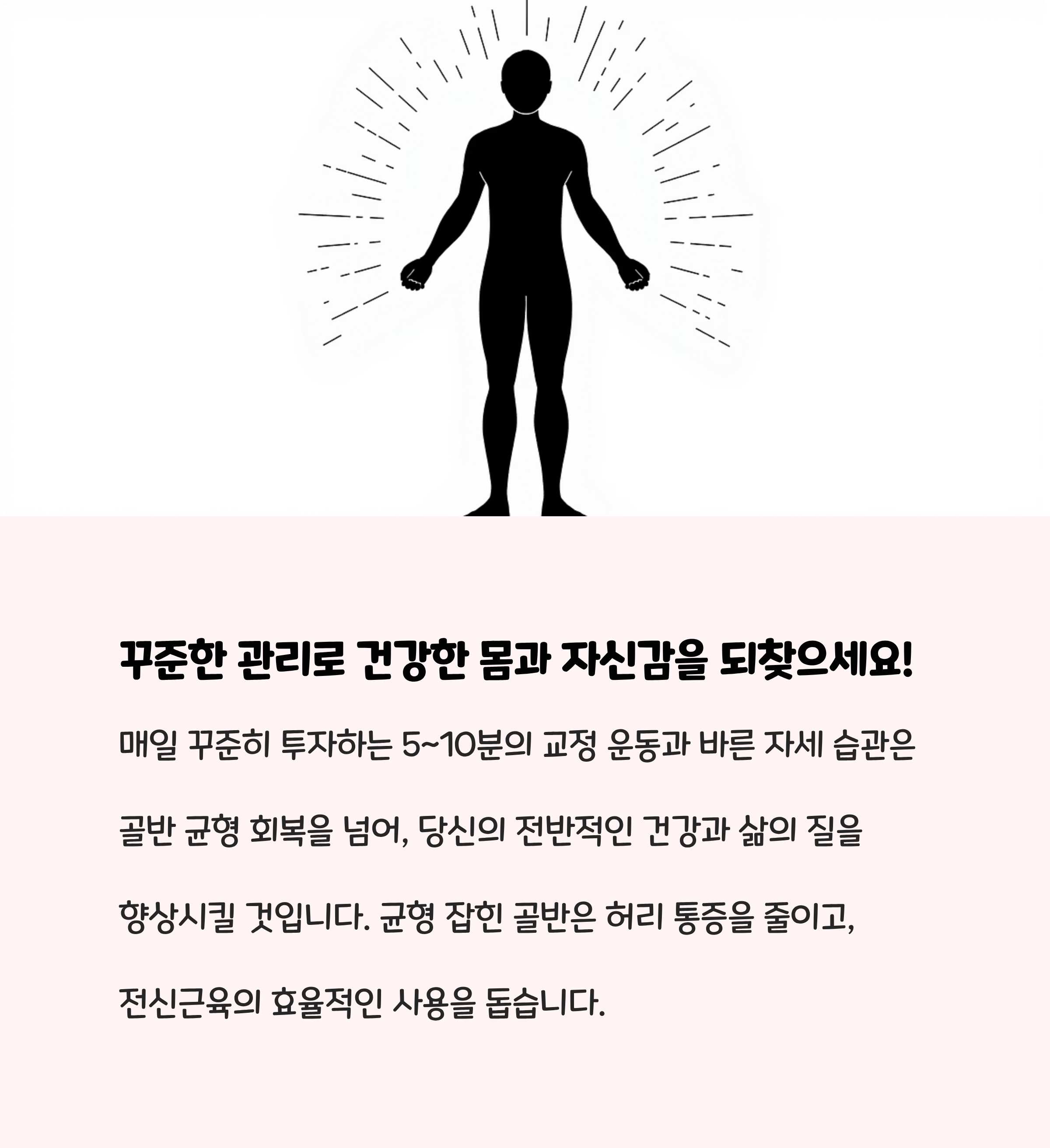 | 수건/책 교정법 | 1일 1회 | 10~20분 | 좌우 균형 회복 | 과도한 압박 주의 |