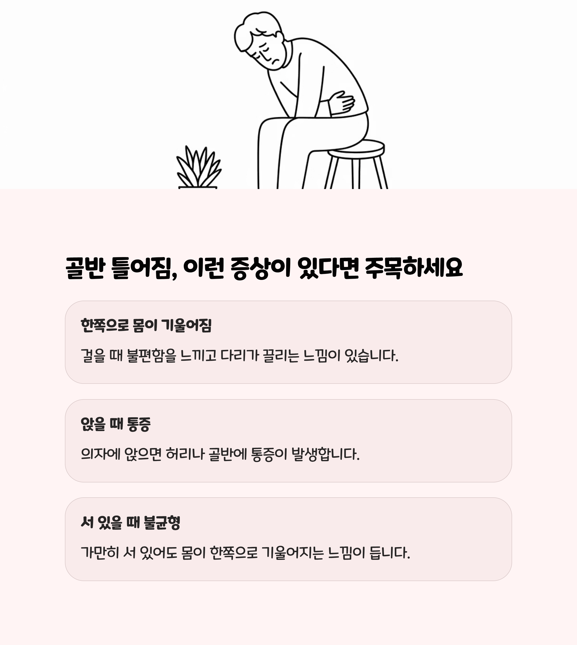- 허벅지, 엉덩이에 만져지는 높이 차이, 앉았을 때 의복이 한쪽으로 돌아가는 현상 등이 대표적 징후입니다.
