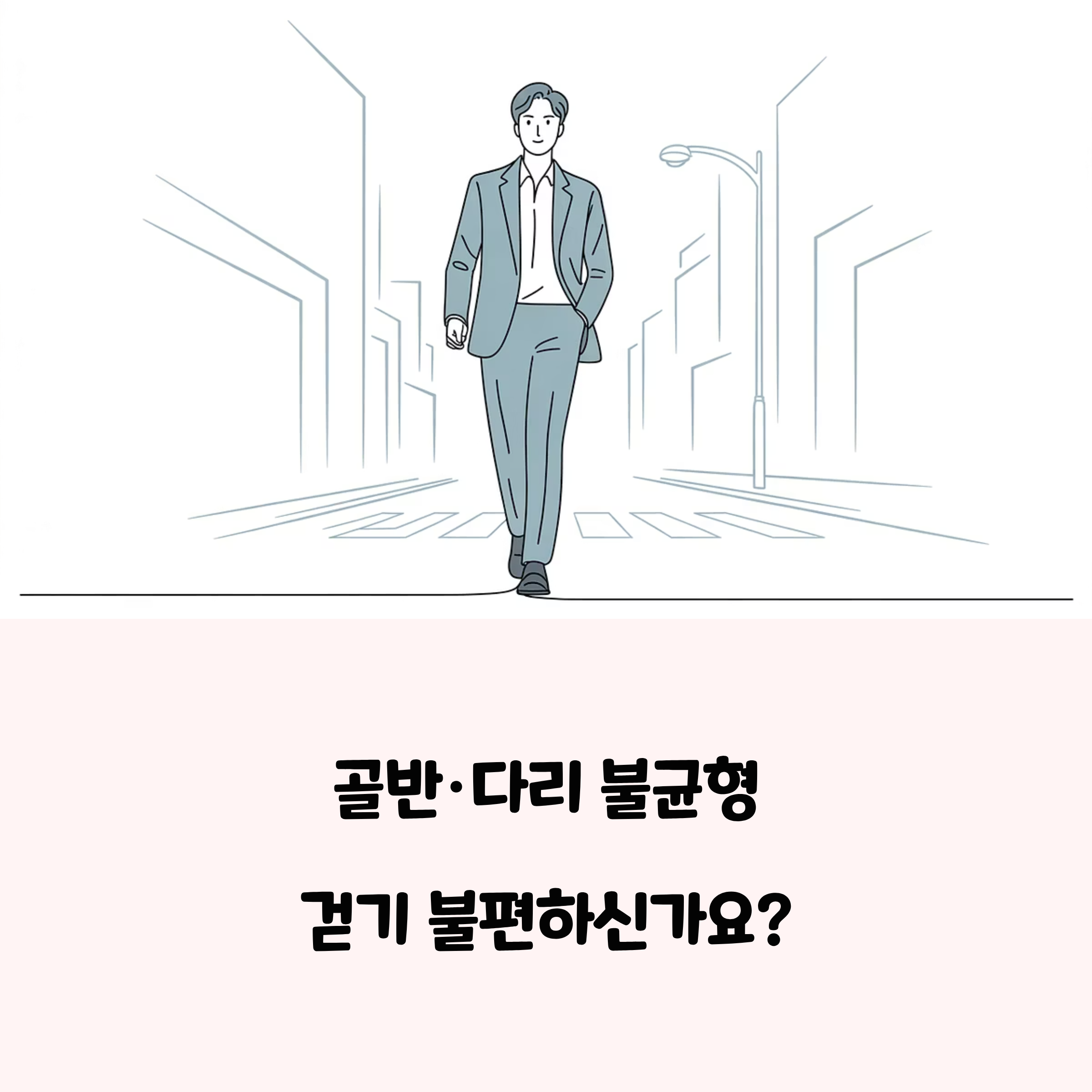 생활 속 한쪽 다리로 체중 싣기, 짝다리 자세, 일상적인 앉은 자세의 불균형 등이 누적되면 골반이 틀어지며 다리 길이 차이가 1~2cm까지 날 수 있습니다. 이는 한쪽의 근육 단축, 인대 불균형, 고관절의 회전 등 복합 문제와 연결되어 걷는 자세, 신체 중심, 균형 모두를 흐트러뜨릴 수 있습니다.