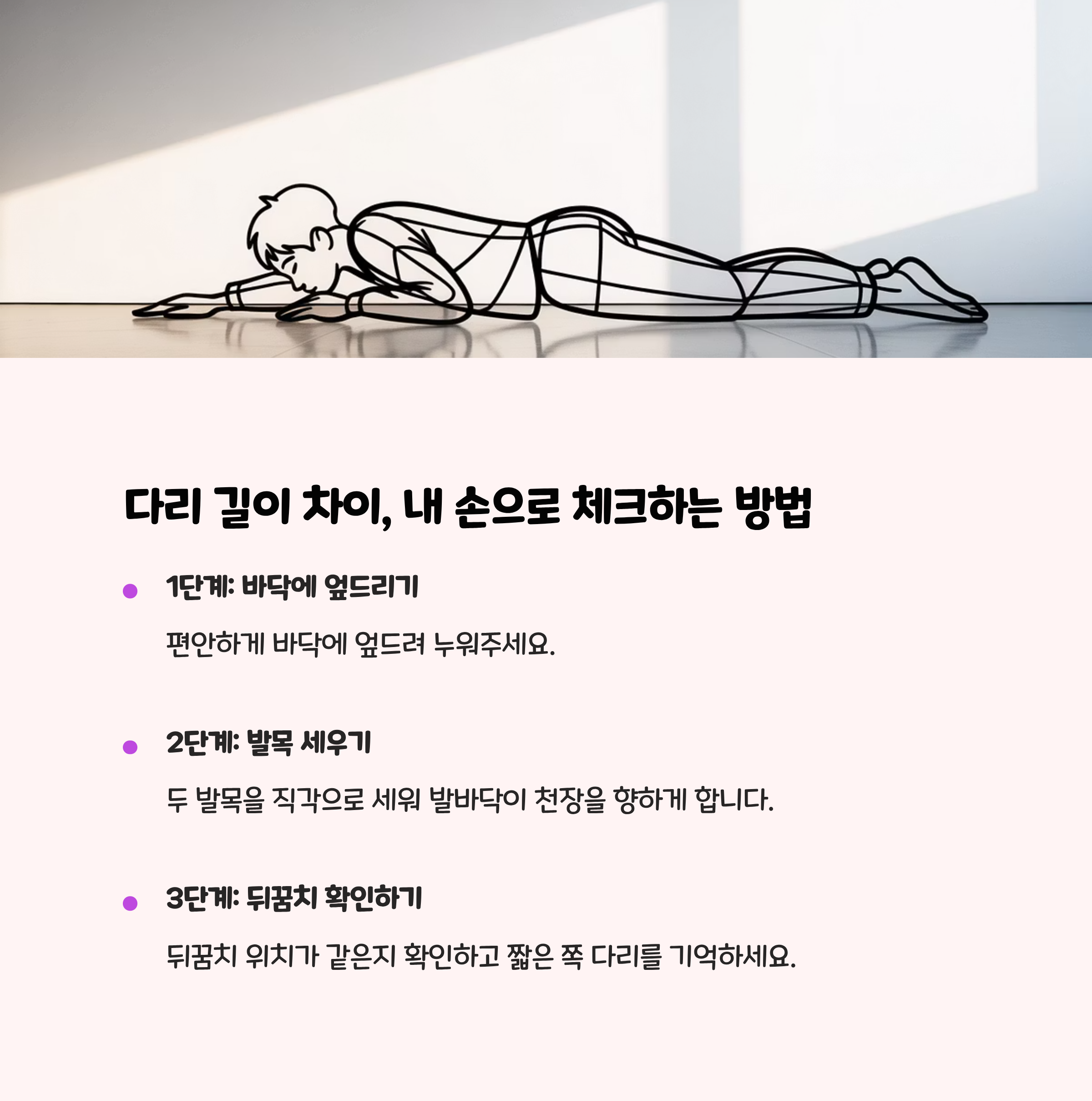 - 거울 앞에서 두다리 길이 및 골반 좌우 높이를 눈으로 확인합니다.