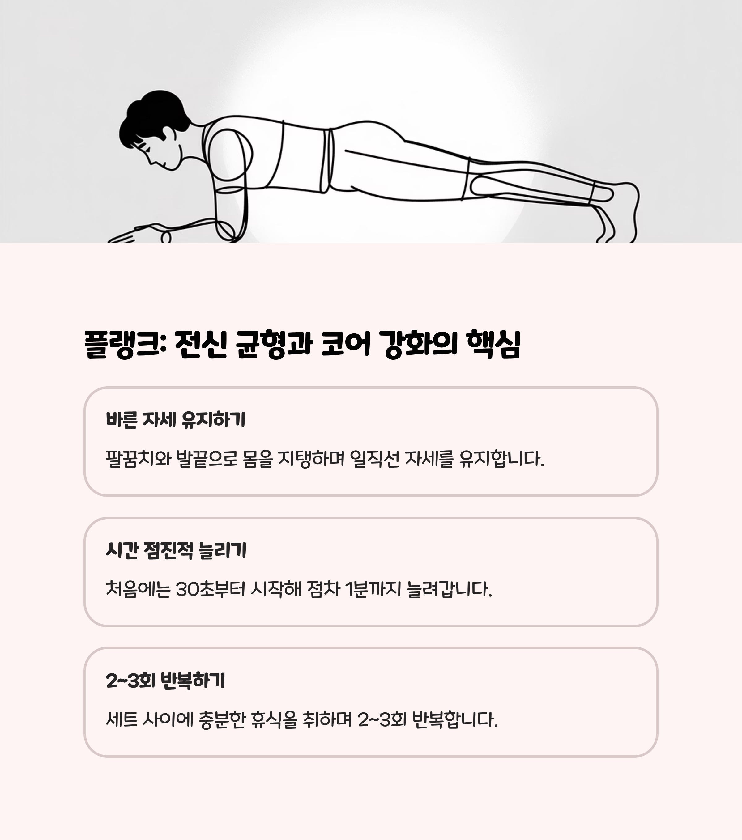 | 플랭크/브릿지 | 주 3~4회 | 10분 | 근력/안정성 향상 | 동작 정확성 중요 |