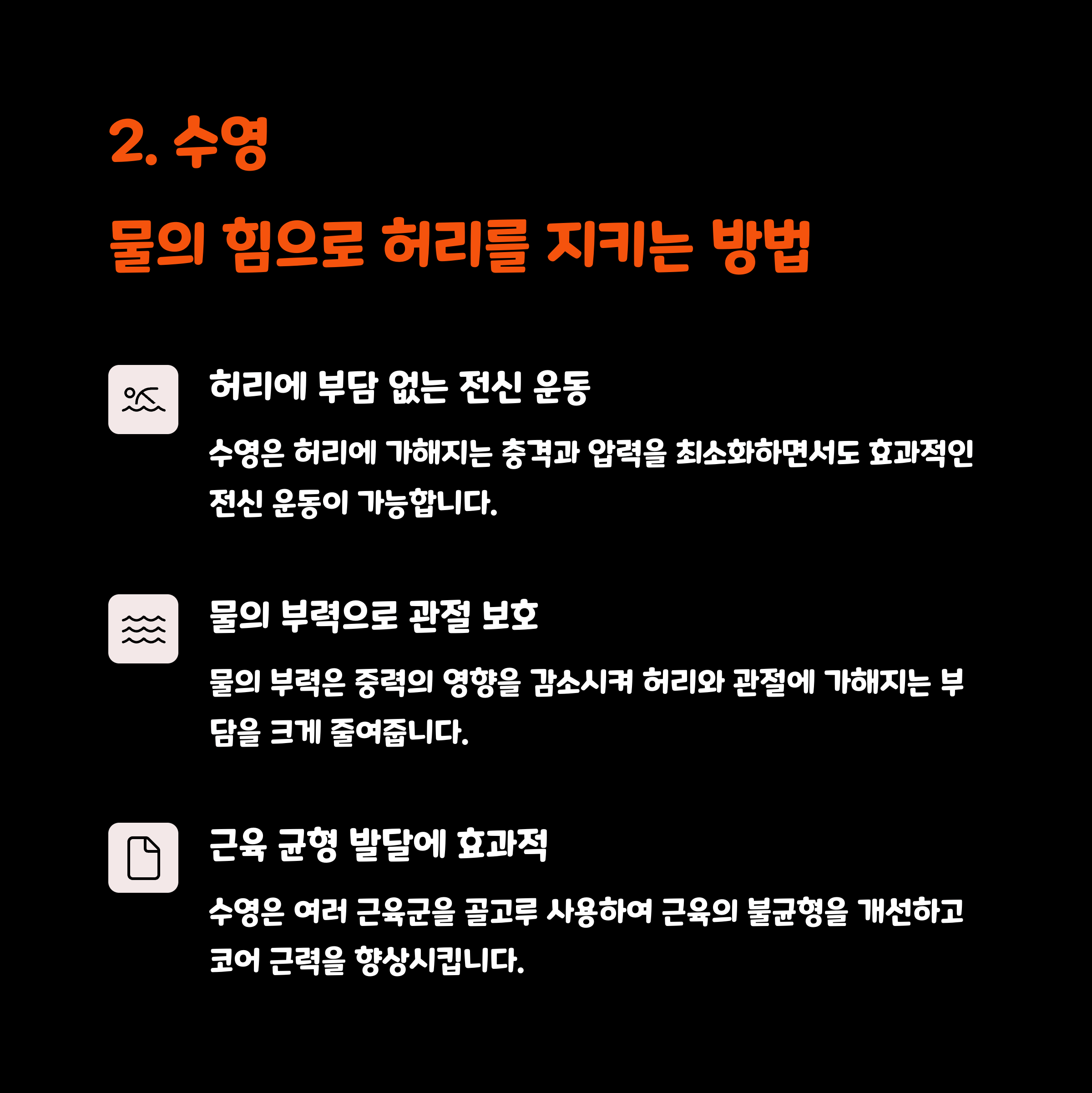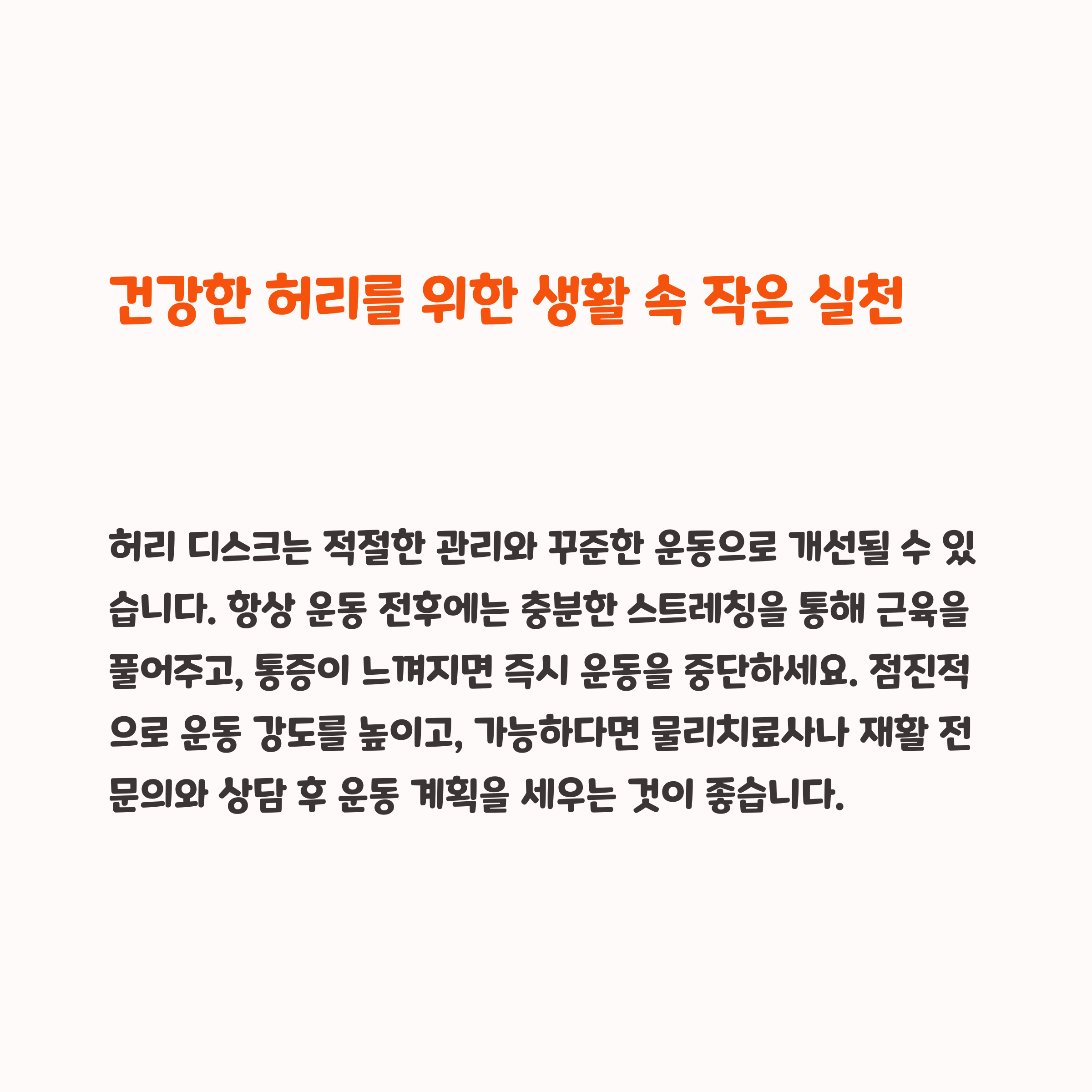 | 운동의 중요성 | 적절한 운동은 통증 완화와 허리 건강 유지에 필수적입니다. |